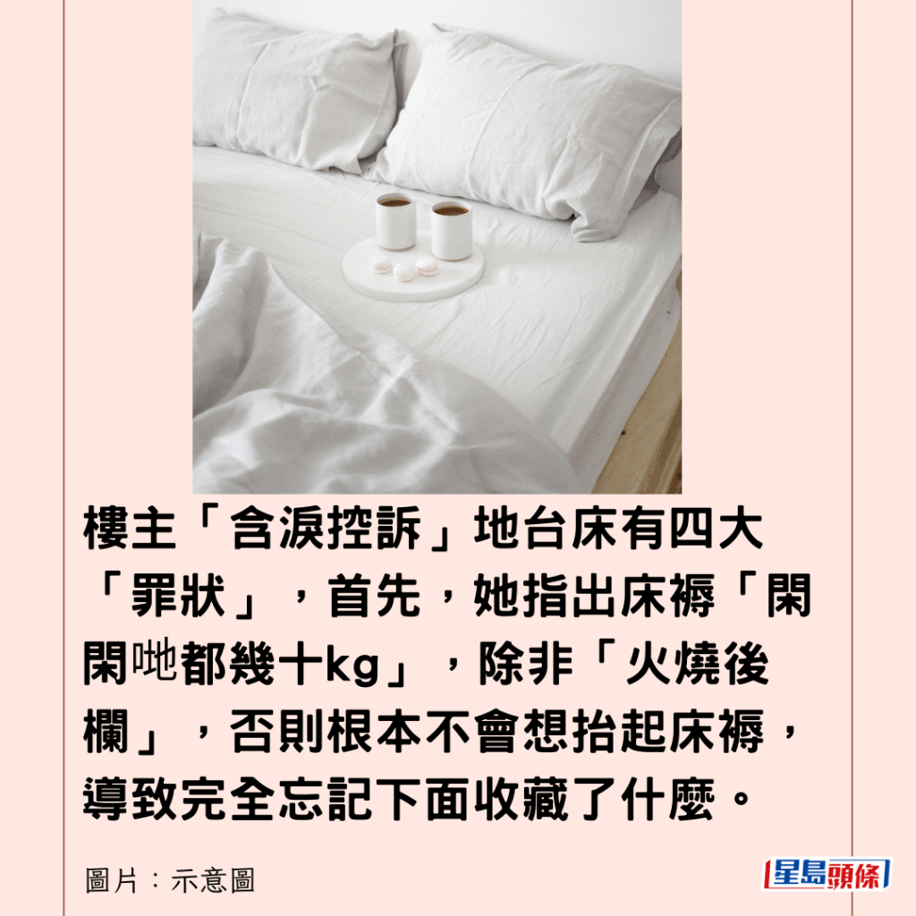 樓主「含淚控訴」地台床有四大「罪狀」,首先,她指出床褥「閑閑哋都幾十kg」,除非「火燒後欄」,否則根本不會想抬起床褥,導致完全忘記下面收藏了什麼。其次,正因整個過程太麻煩,即使有雜物也不會即時收納,令儲物功能形同虛設,更造成「極大心理壓力」。
