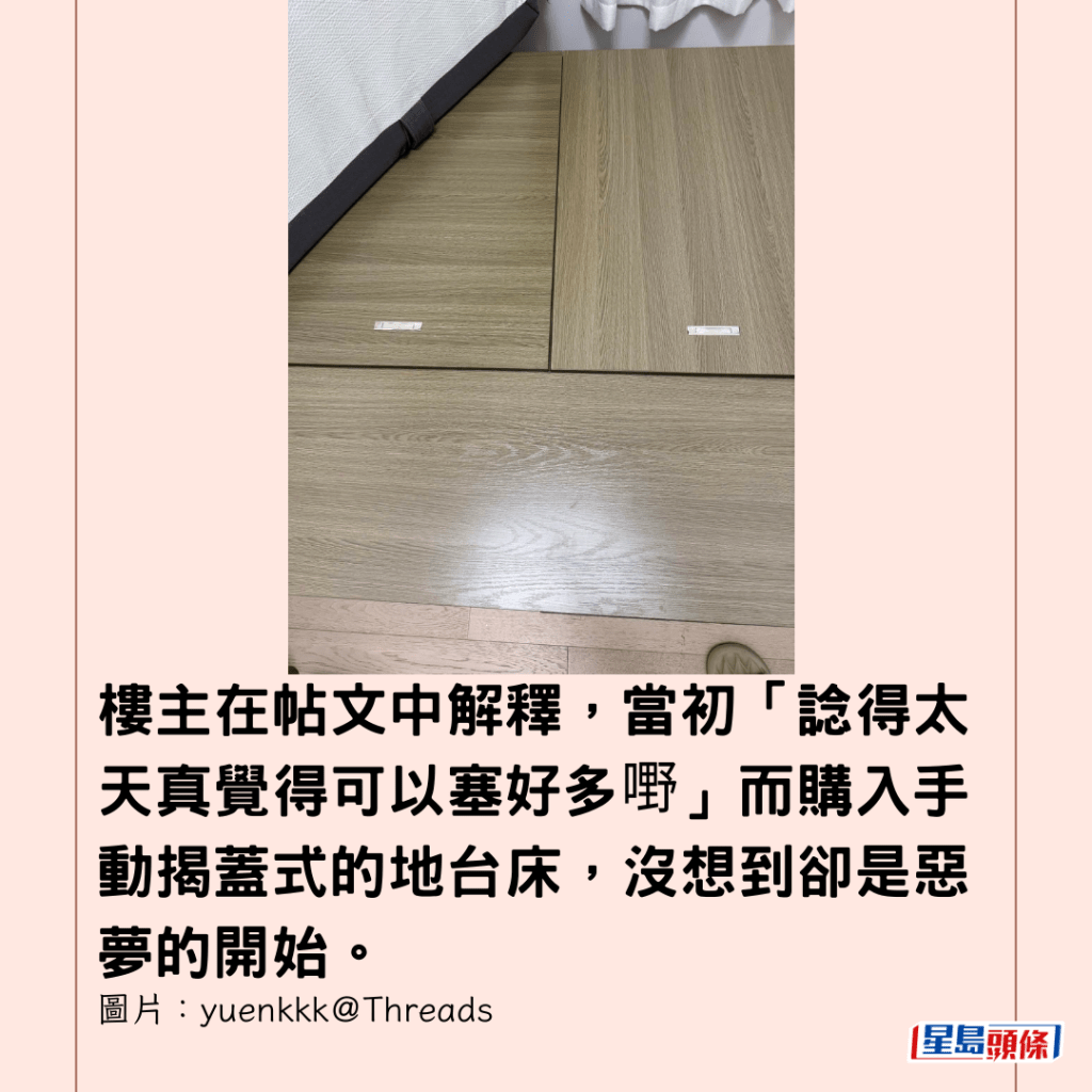 樓主在帖文中解釋,當初「諗得太天真覺得可以塞好多嘢」而購入手動揭蓋式的地台床,沒想到卻是惡夢的開始。她附上圖片,相中可見床褥被掀起一角,下方是需要手動逐塊抬起的木製地台門板。