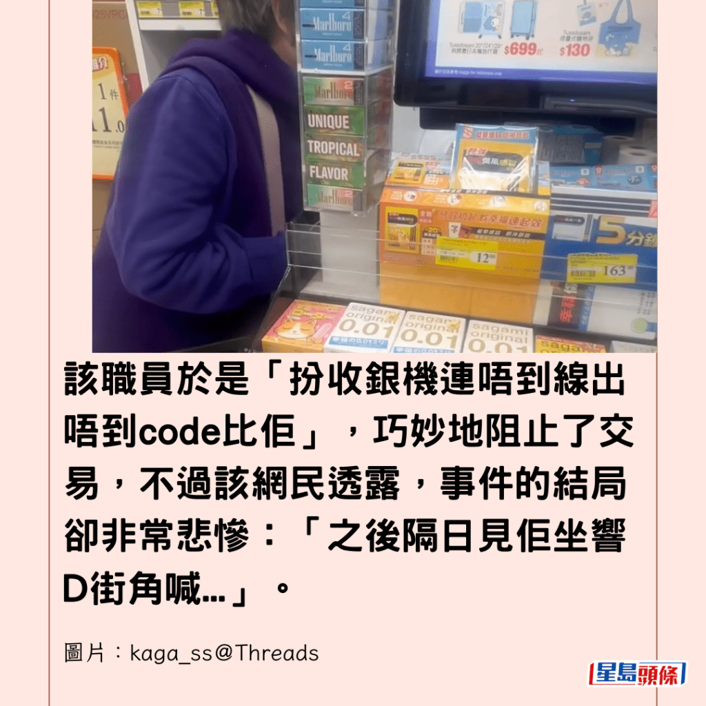 該職員於是「扮收銀機連唔到線出唔到code比佢」,巧妙地阻止了交易,不過該網民透露,事件的結局卻非常悲慘:「之後隔日見佢坐響D街角喊…」。