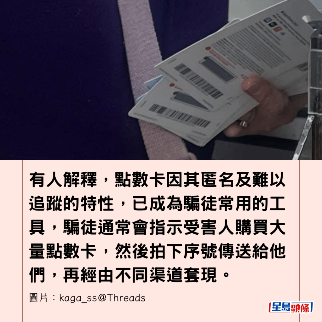 不少網民則聚焦樓主今次目擊的事件,不少網民對於婆婆陷入點數卡騙局表示不解:「其實D點數卡點用?最後可以套現返錢?」有人解釋,點數卡因其匿名及難以追蹤的特性,已成為騙徒常用的工具,騙徒通常會指示受害人購買大量點數卡,然後拍下序號傳送給他們,再經由不同渠道套現。