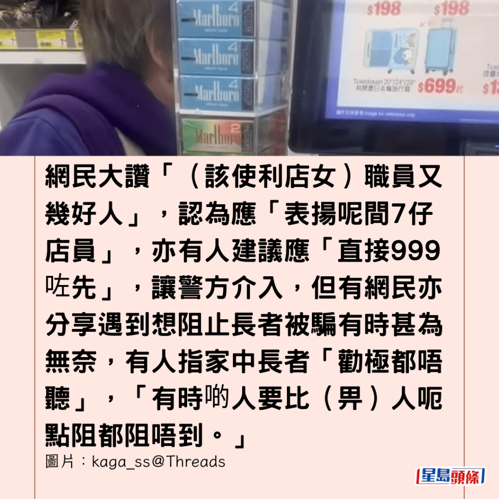網民大讚「(該使利店女)職員又幾好人」,認為應「表揚呢間7仔店員」,亦有人建議應「直接999咗先」,讓警方介入,但有網民亦分享遇到想阻止長者被騙有時甚為無奈,有人指家中長者「勸極都唔聽」,「有時啲人要比(畀)人呃點阻都阻唔到。」