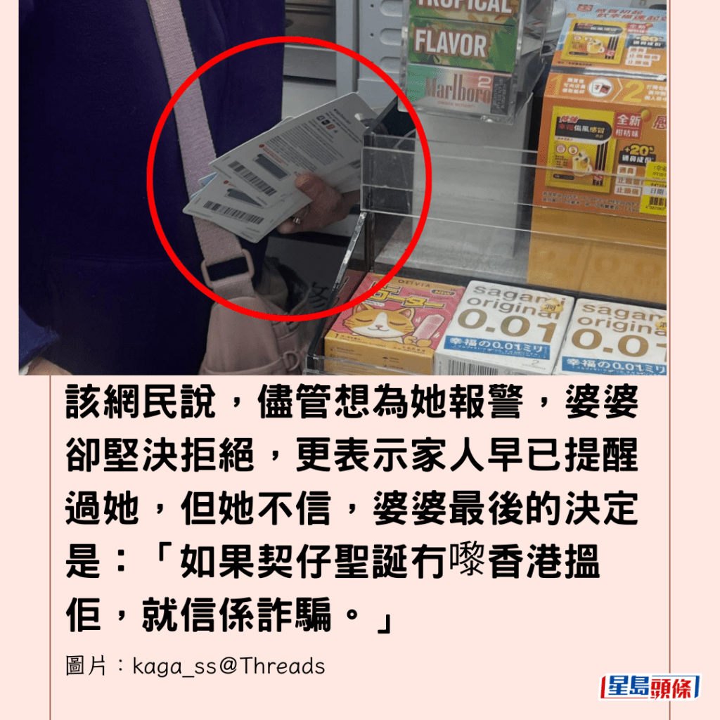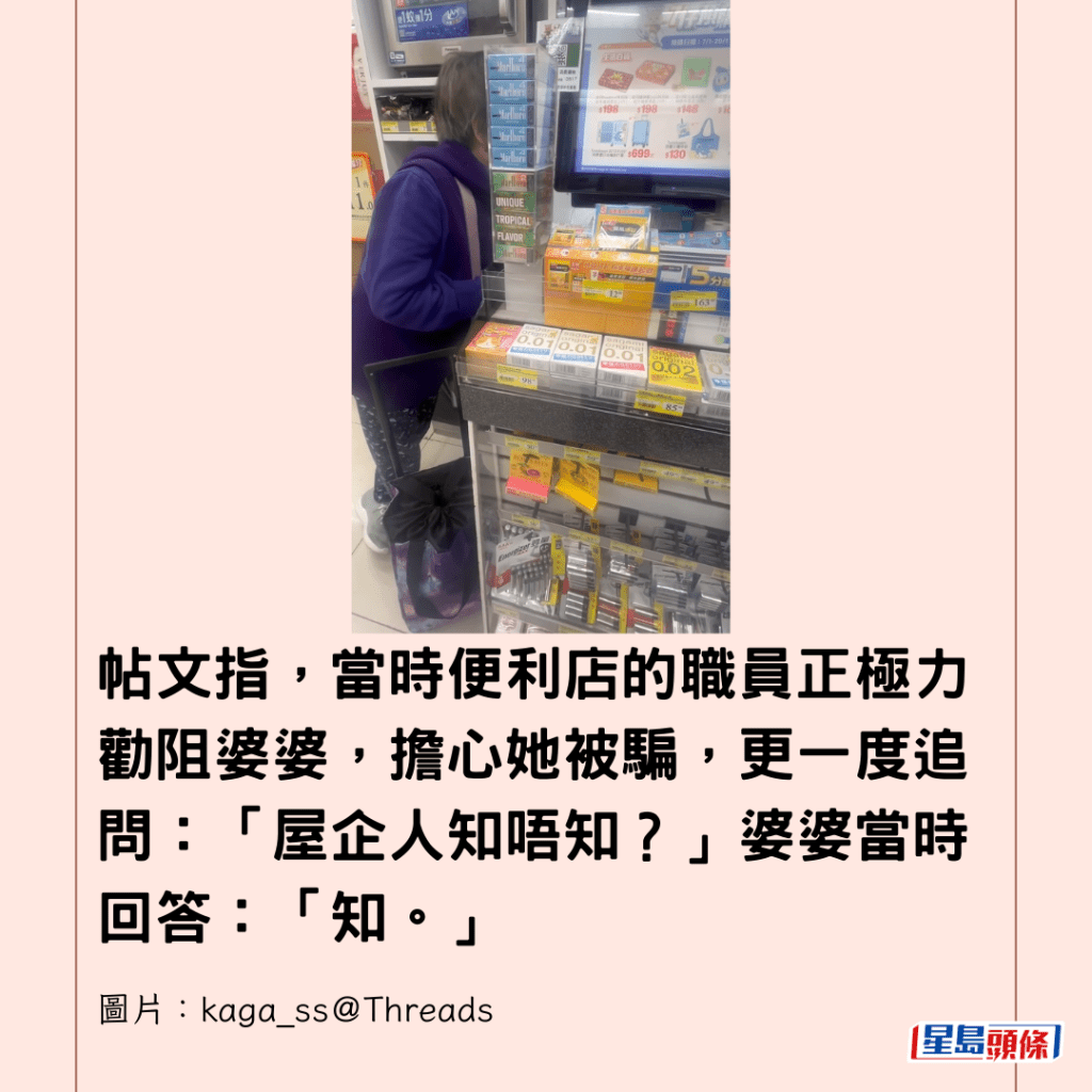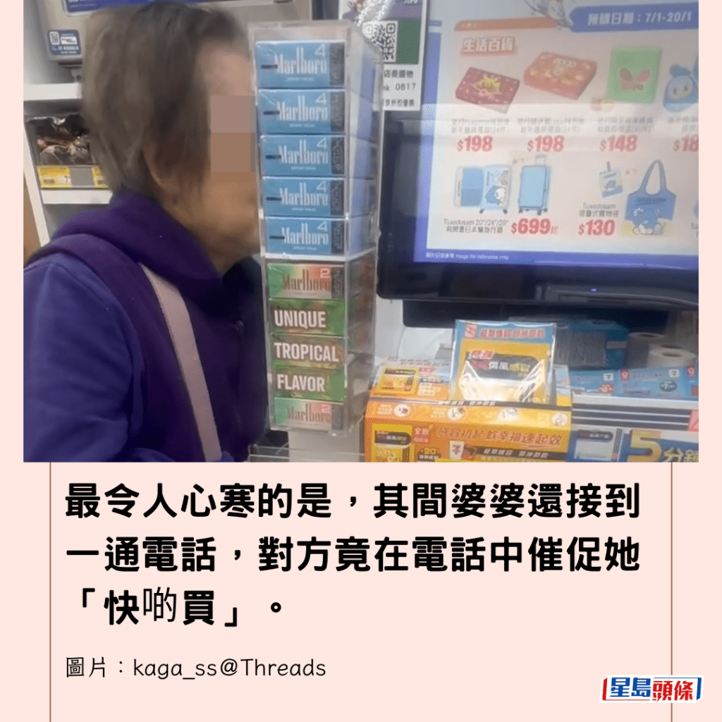 帖文指,當時便利店的職員正極力勸阻婆婆,擔心她被騙,更一度追問:「屋企人知唔知?」婆婆當時回答:「知。」最令人心寒的是,其間婆婆還接到一通電話,對方竟在電話中催促她「快啲買」。