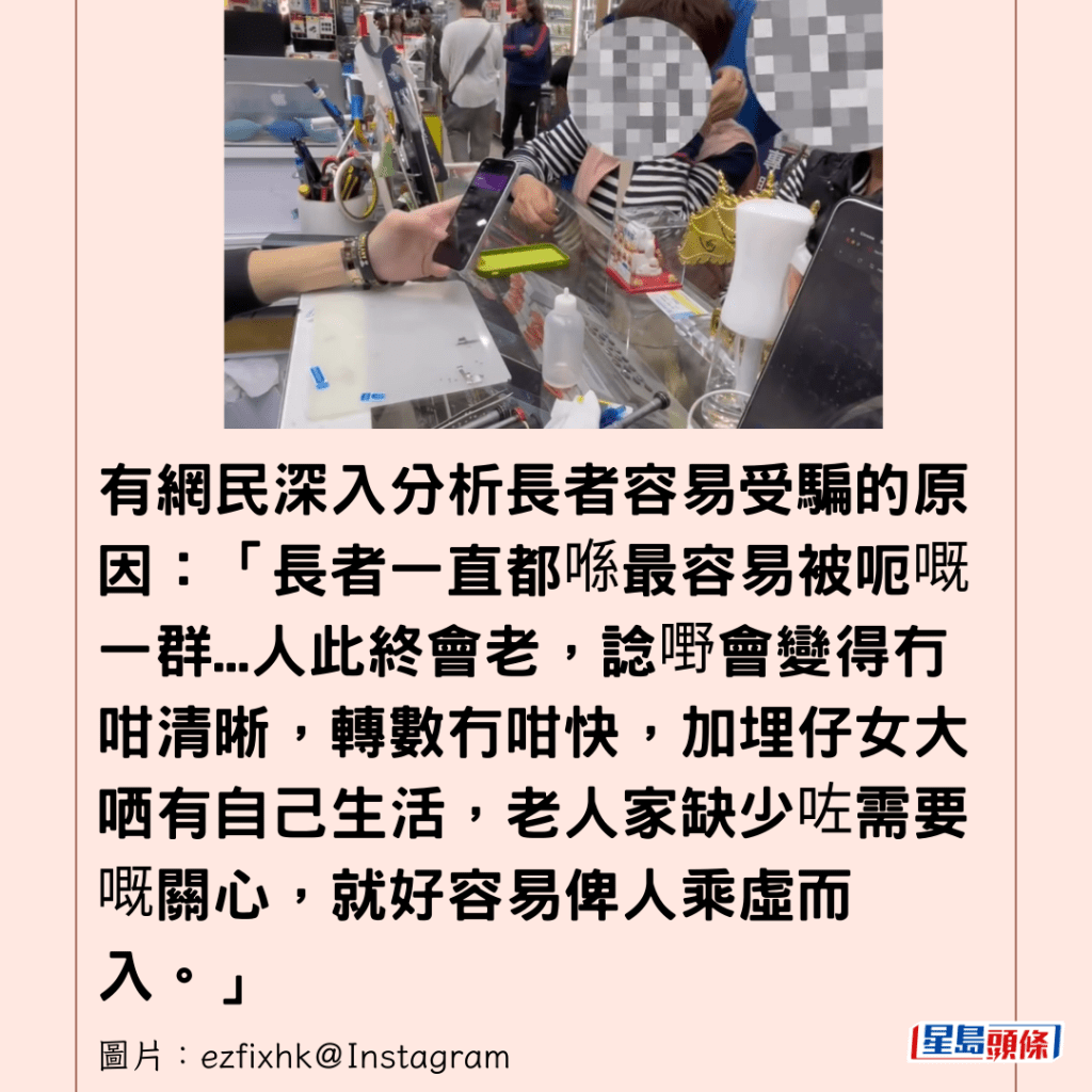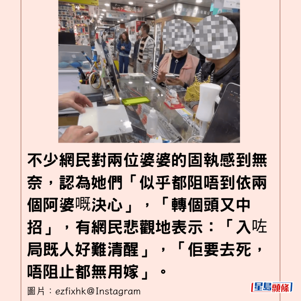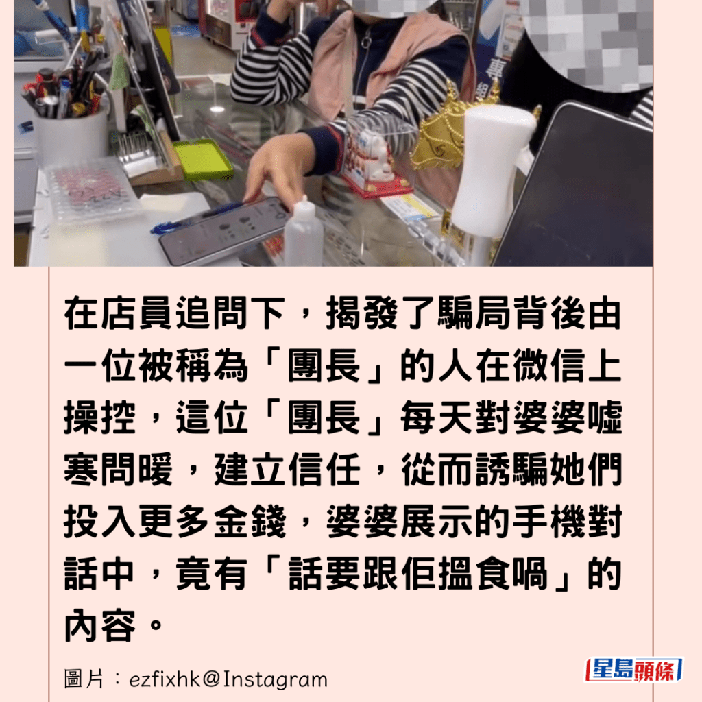 帖文指,當時便利店的職員正極力勸阻婆婆,擔心她被騙,更一度追問:「屋企人知唔知?」婆婆當時回答:「知。」最令人心寒的是,其間婆婆還接到一通電話,對方竟在電話中催促她「快啲買」。