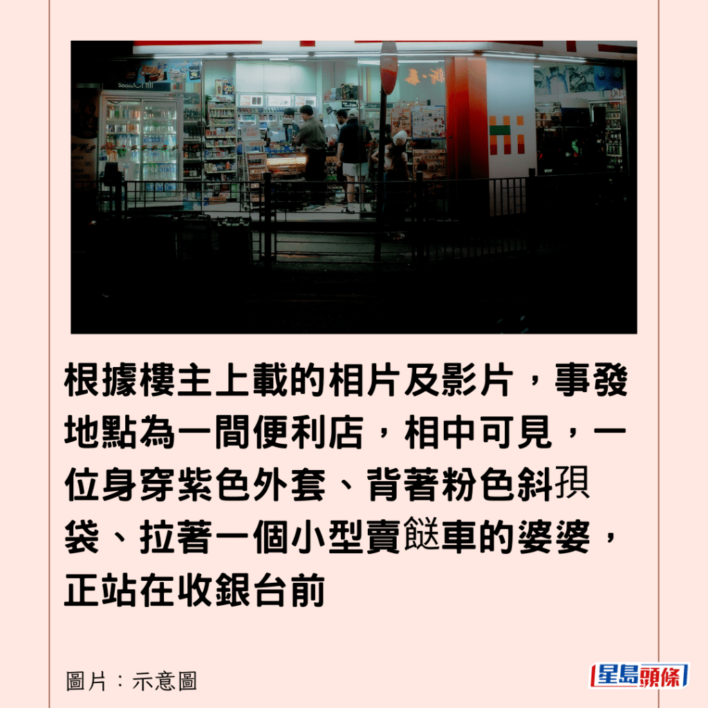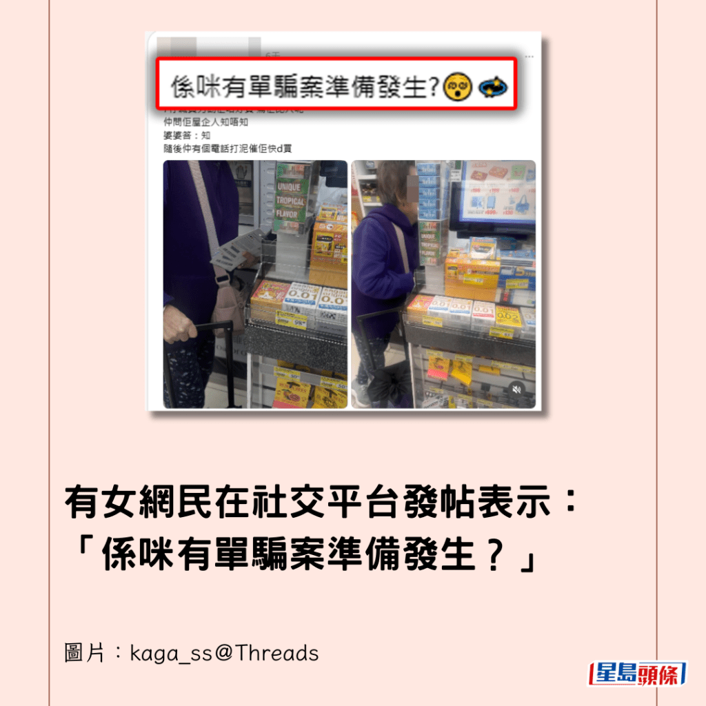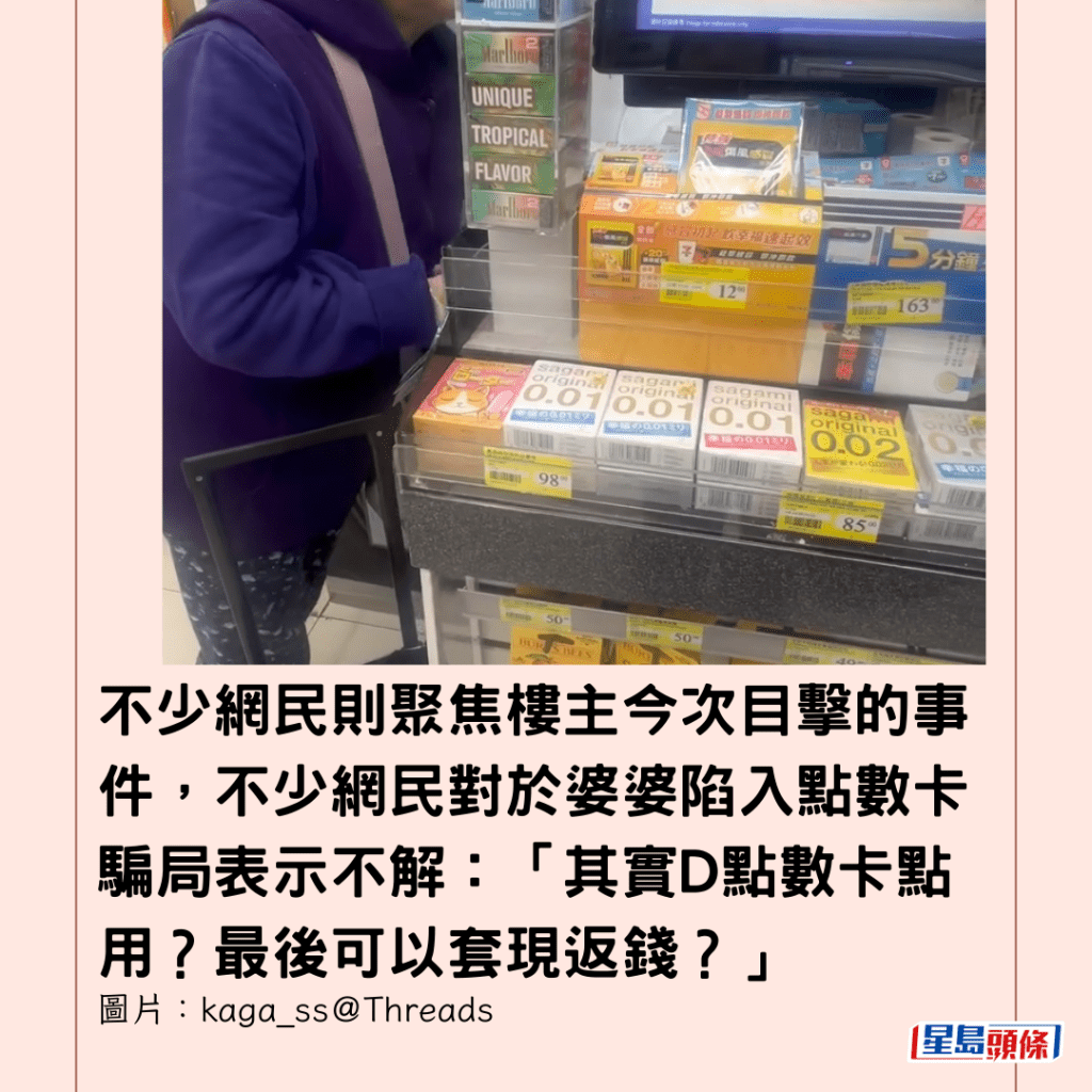 有女網民在社交平台發帖表示:「係咪有單騙案準備發生?」根據樓主上載的相片及影片,事發地點為一間便利店,相中可見,一位身穿紫色外套、背著粉色斜孭袋、拉著一個小型賣餸車的婆婆,正站在收銀台前,她手上拿著一疊點數卡,神情似乎有些不知所措。