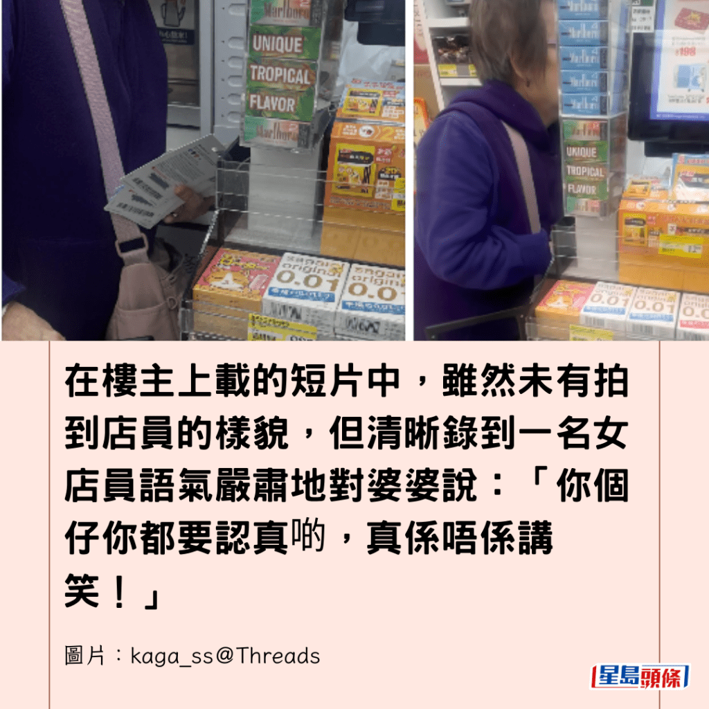 有女網民在網上發片發文指,在便利店目擊一名婆婆手持一疊點數卡,準備付款,懷疑她正墮入騙案:「係咪有單騙案準備發生?」她直擊機警的女店員力圖死守婆婆棺材本,展開一列串對質,甚至大爆金句的情況。