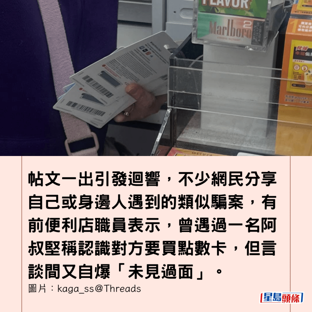 帖文一出引發迴響,不少網民分享自己或身邊人遇到的類似騙案,有前便利店職員表示,曾遇過一名阿叔堅稱認識對方要買點數卡,但言談間又自爆「未見過面」。