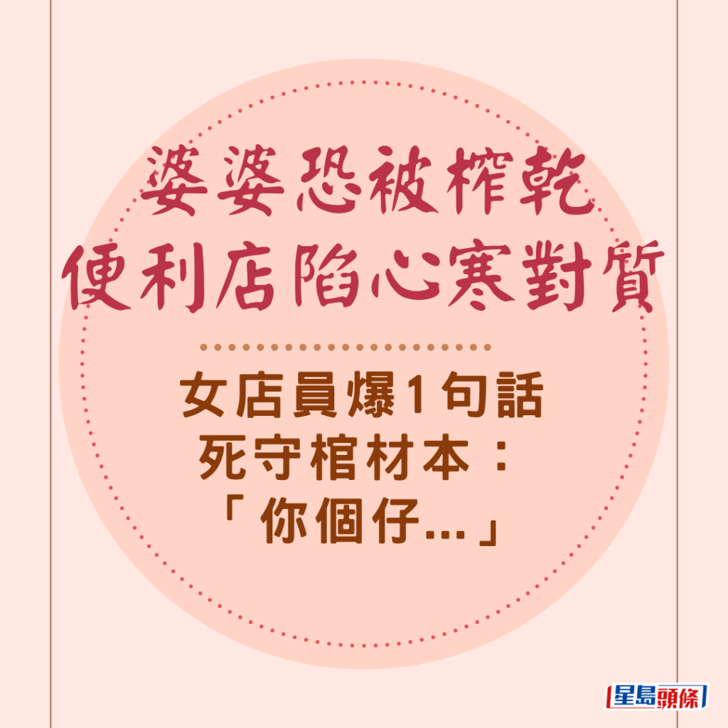 婆婆恐被榨乾便利店陷心寒對質 女店員爆一句話死守棺材本:「你個仔…」↓↓↓↓