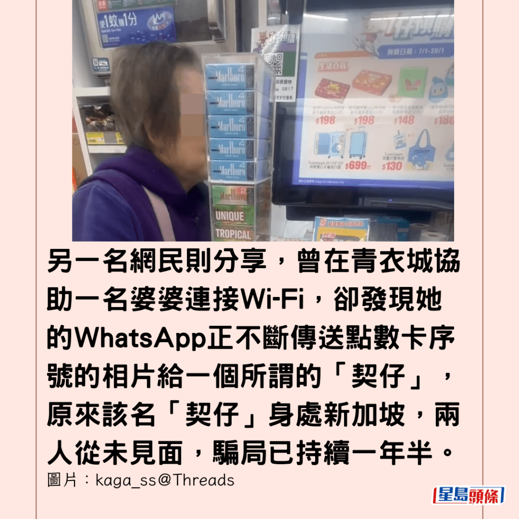 另一名網民則分享,曾在青衣城協助一名婆婆連接Wi-Fi,卻發現她的WhatsApp正不斷傳送點數卡序號的相片給一個所謂的「契仔」,原來該名「契仔」身處新加坡,兩人從未見面,騙局已持續一年半。