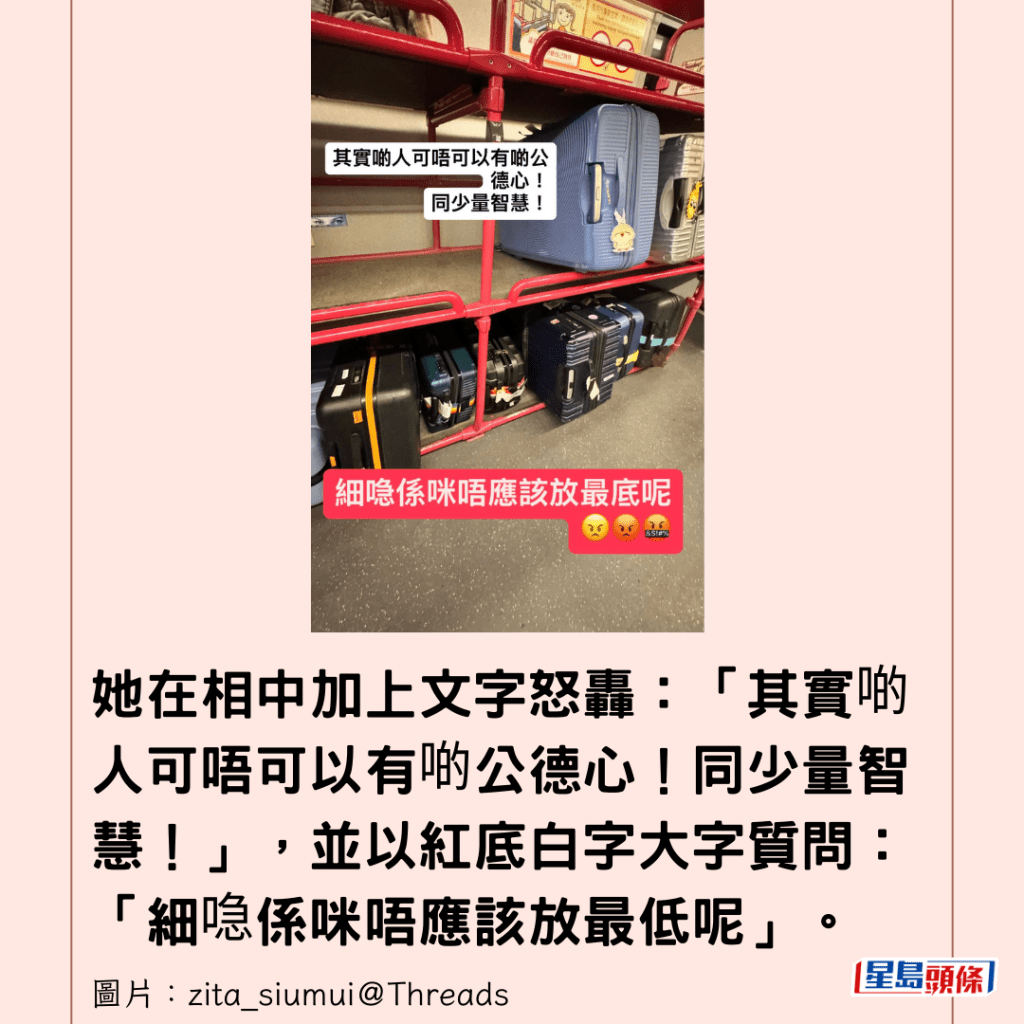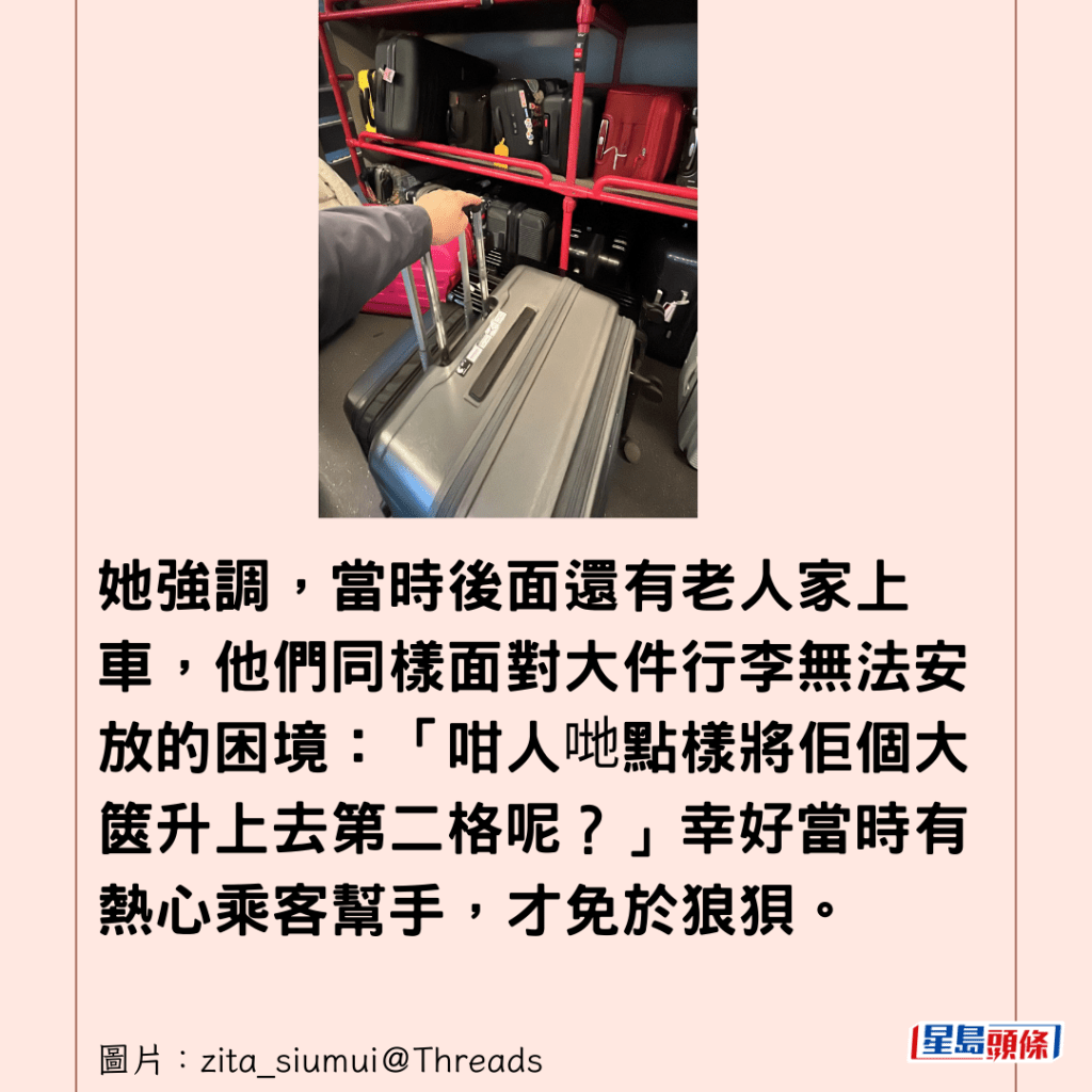 樓主在帖文中解釋,她的大行李箱重達30公斤,根本難以抬到行李架的第二或第三格,她憶述:「上次我30kg,我真係差啲升唔到上去。」她強調,當時後面還有老人家上車,他們同樣面對大件行李無法安放的困境:「咁人哋點樣將佢個大篋升上去第二格呢?」幸好當時有熱心乘客幫手,才免於狼狽。