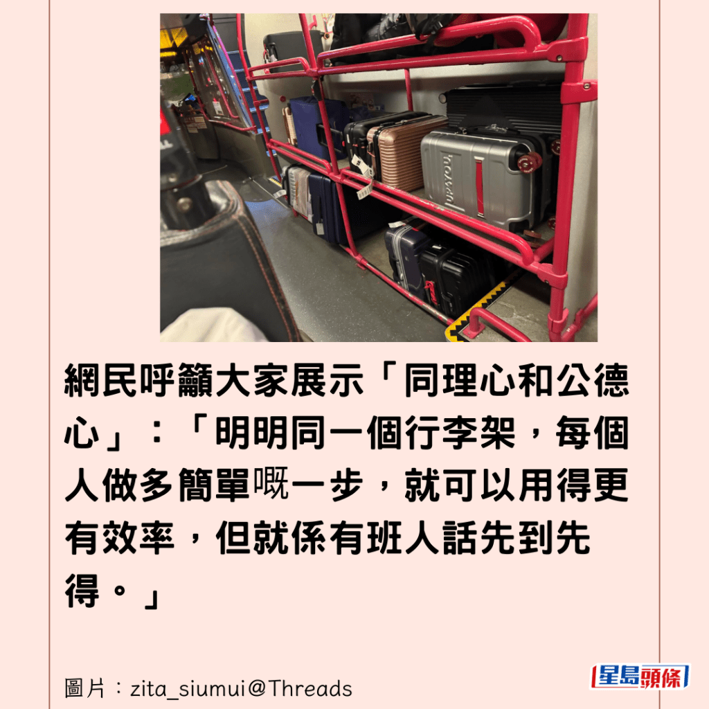 網民呼籲大家展示「同理心和公德心」:「明明同一個行李架,每個人做多簡單嘅一步,就可以用得更有效率,但就係有班人話先到先得。」