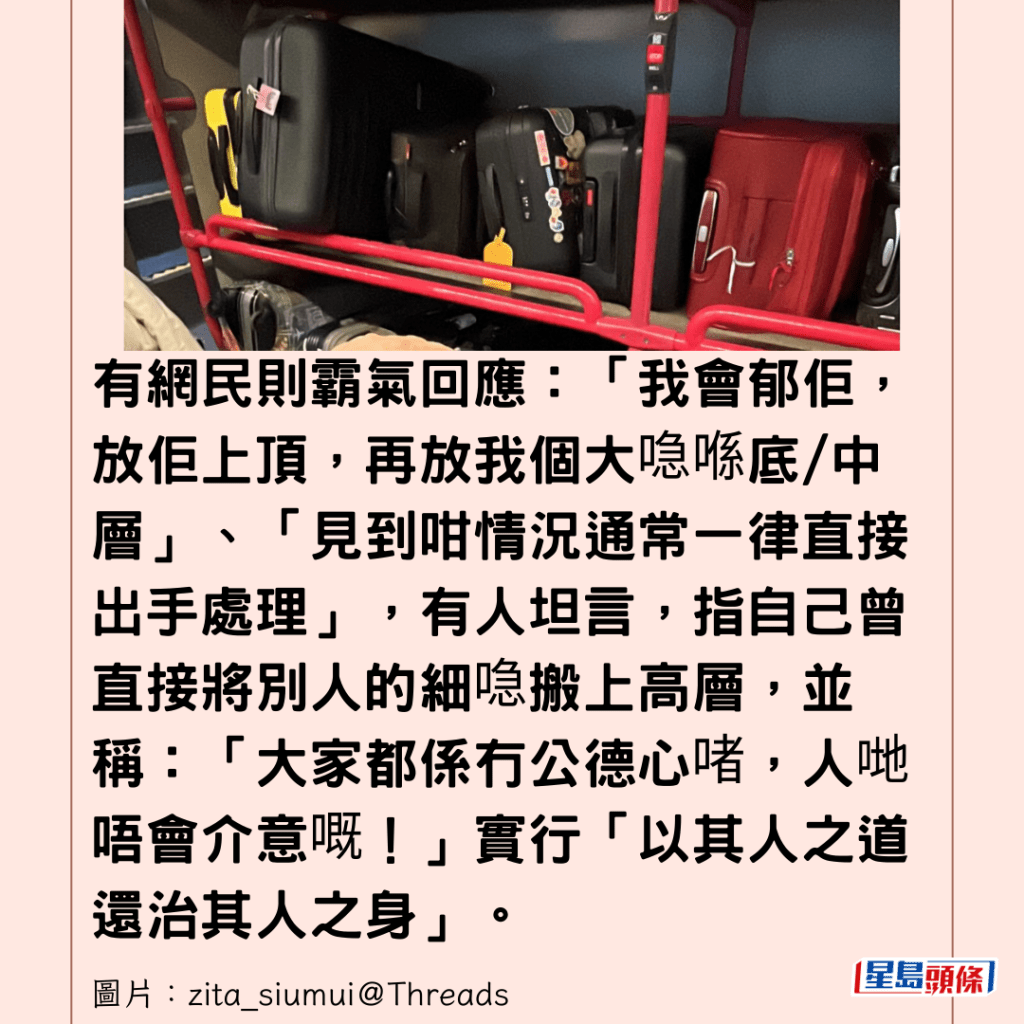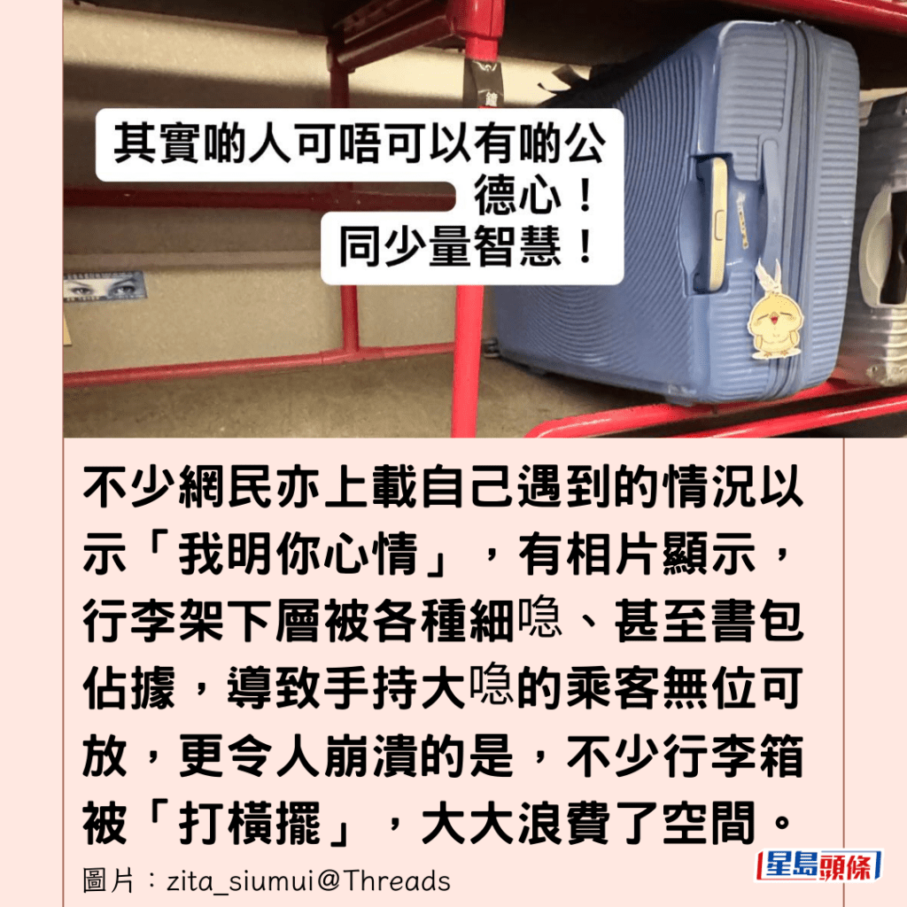 不少網民亦上載自己遇到的情況以示「我明你心情」,有相片顯示,行李架下層被各種細喼、甚至書包佔據,導致手持大喼的乘客無位可放,更令人崩潰的是,不少行李箱被「打橫擺」,大大浪費了空間。