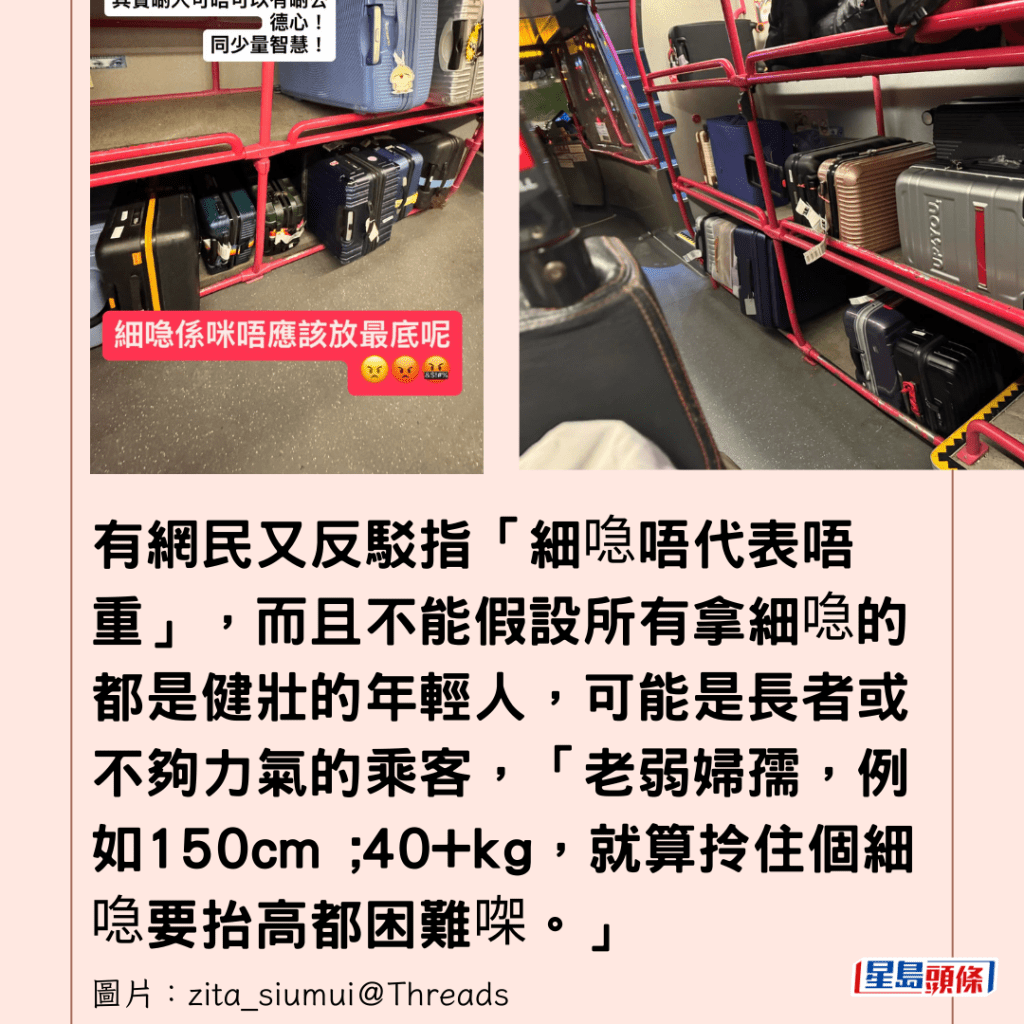 有網民又反駁指「細喼唔代表唔重」,而且不能假設所有拿細喼的都是健壯的年輕人,可能是長者或不夠力氣的乘客,「老弱婦孺,例如150cm ;40+kg,就算拎住個細喼要抬高都困難㗎。」