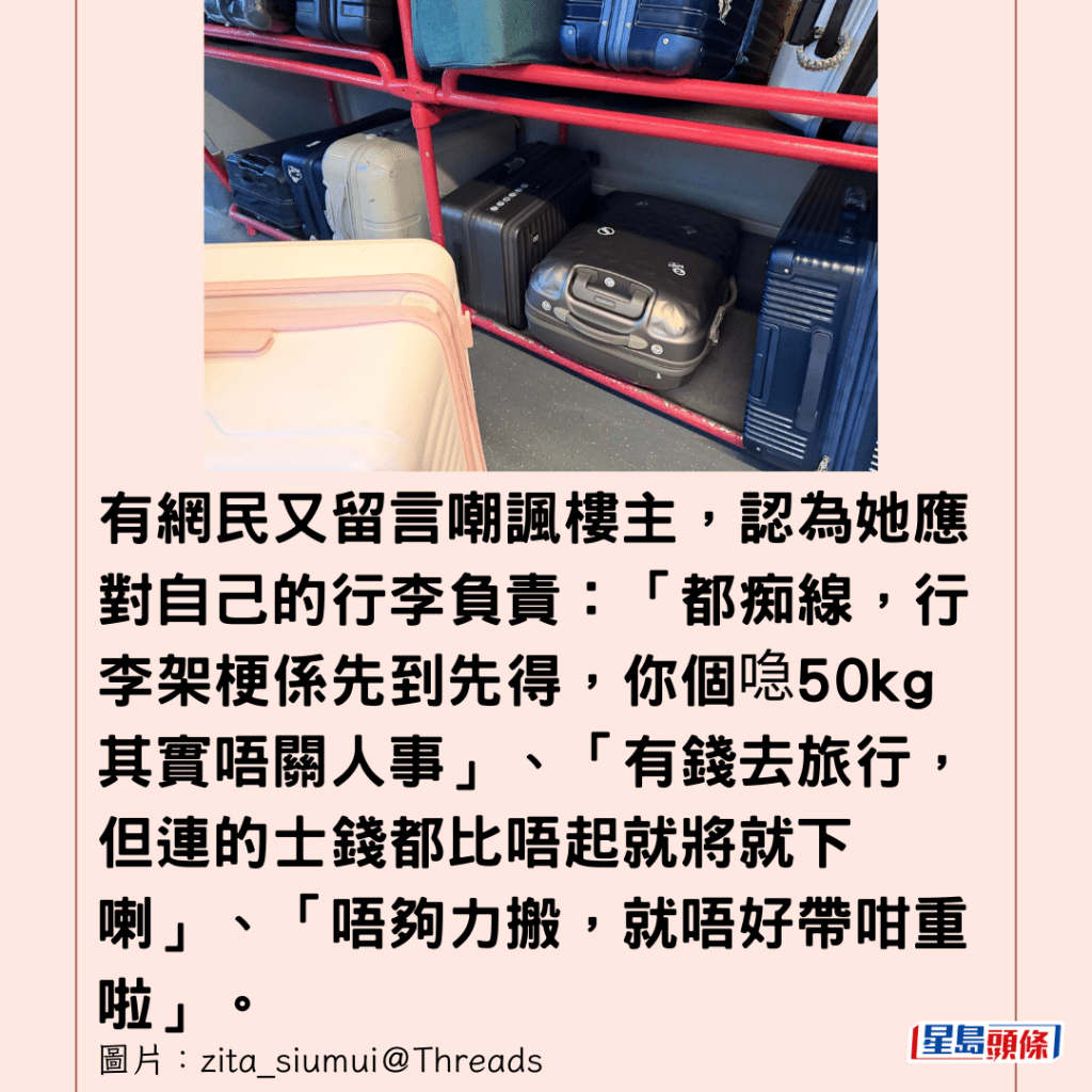 有網民又留言嘲諷樓主,認為她應對自己的行李負責:「都痴線,行李架梗係先到先得,你個喼50kg其實唔關人事」、「有錢去旅行,但連的士錢都比唔起就將就下喇」、「唔夠力搬,就唔好帶咁重啦」。