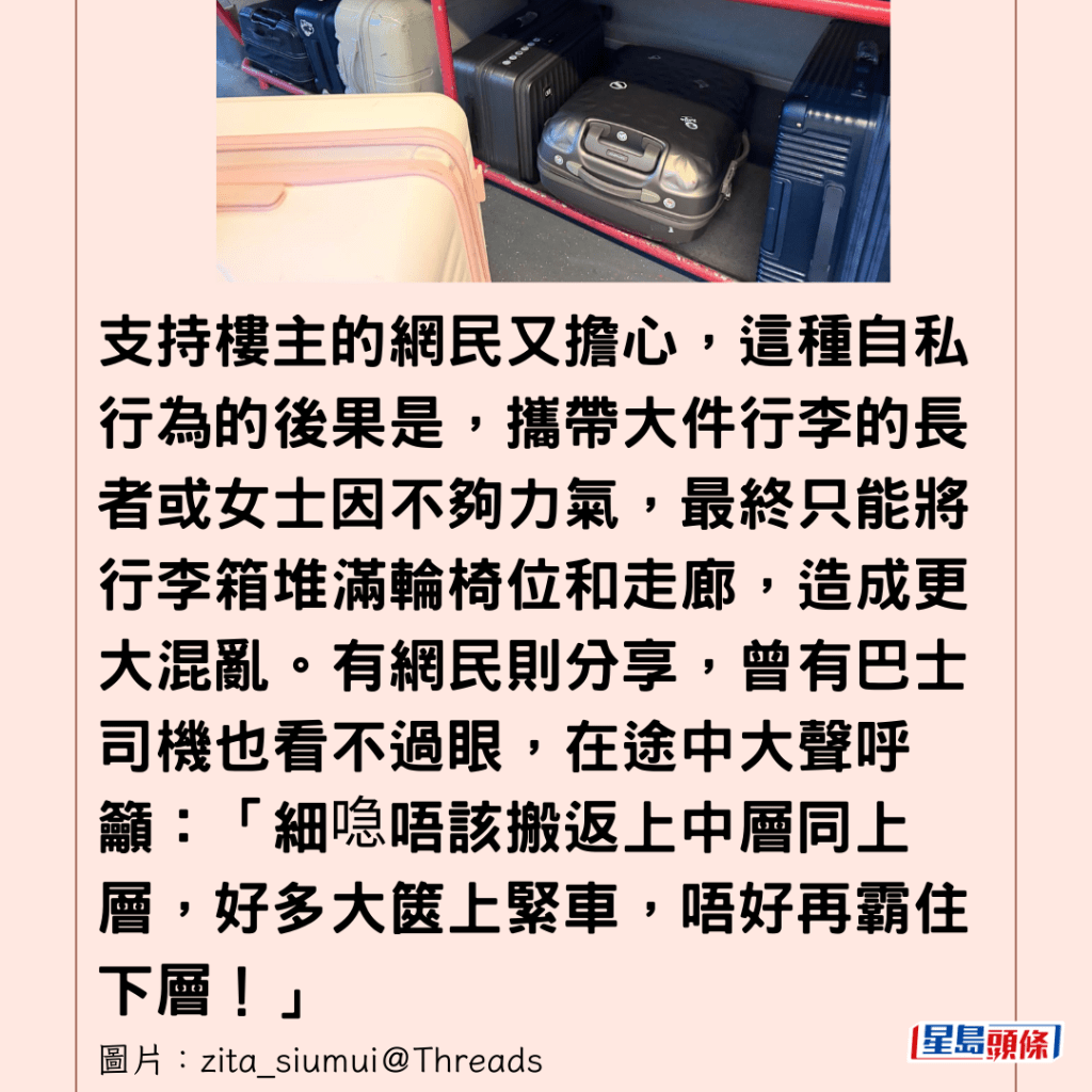 支持樓主的網民又擔心,這種自私行為的後果是,攜帶大件行李的長者或女士因不夠力氣,最終只能將行李箱堆滿輪椅位和走廊,造成更大混亂。有網民則分享,曾有巴士司機也看不過眼,在途中大聲呼籲:「細喼唔該搬返上中層同上層,好多大篋上緊車,唔好再霸住下層!」