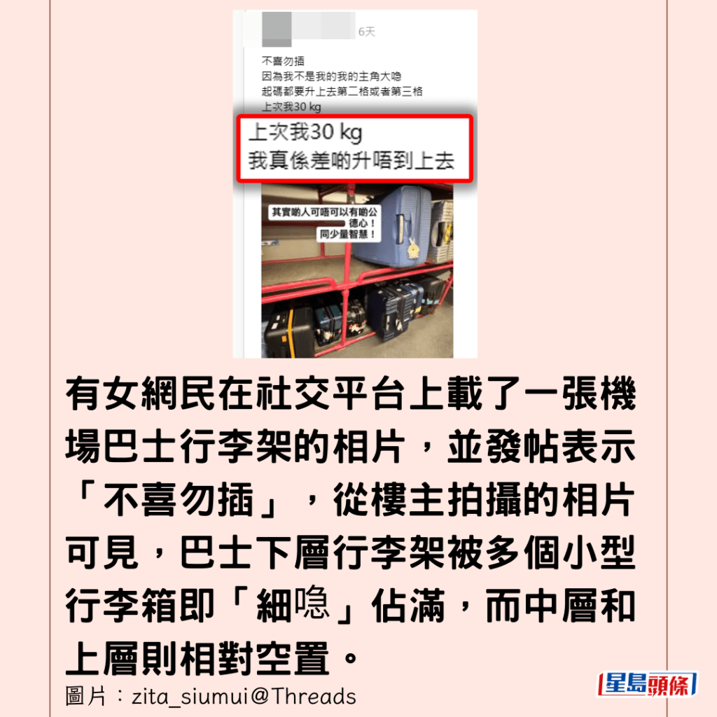 有女網民在社交平台上載了一張機場巴士行李架的相片,並發帖表示「不喜勿插」,從樓主拍攝的相片可見,巴士下層行李架被多個小型行李箱即「細喼」佔滿,而中層和上層則相對空置。