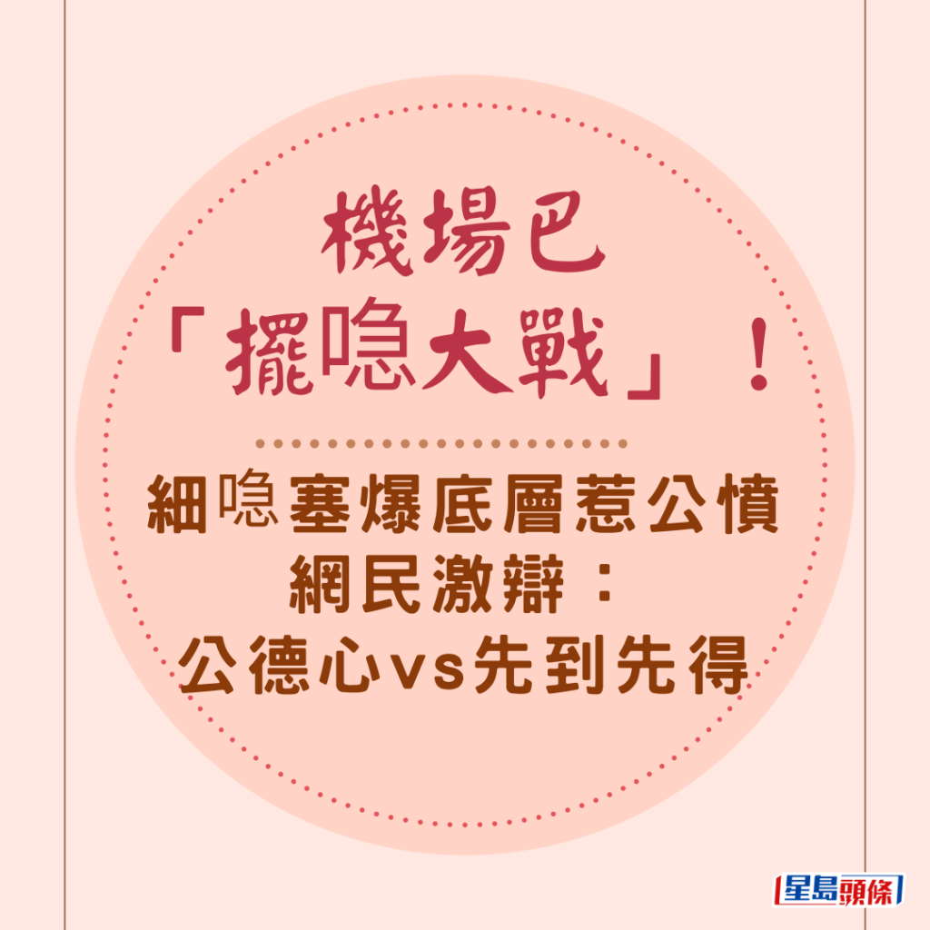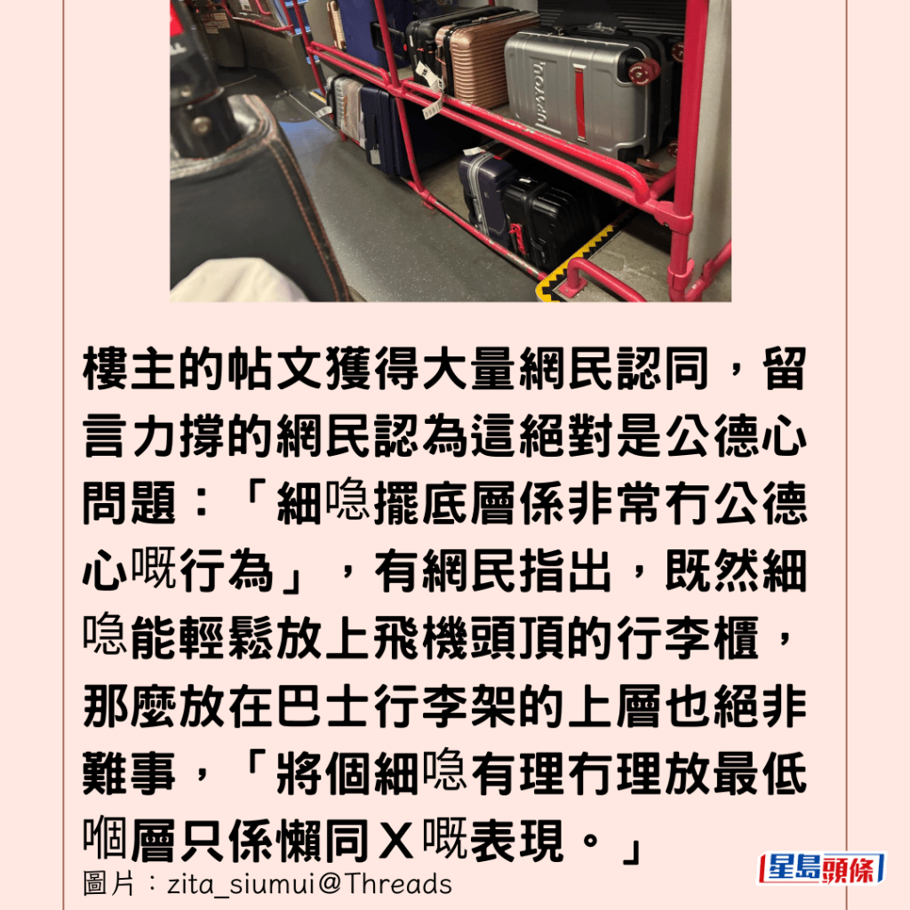 有網民在社交平台發帖,就搭機場巴士擺放行李的問題,提出建議,樓主認為「細喼不應放最底層」,點燃網絡一場關於公德心與個人權利的激烈論戰。