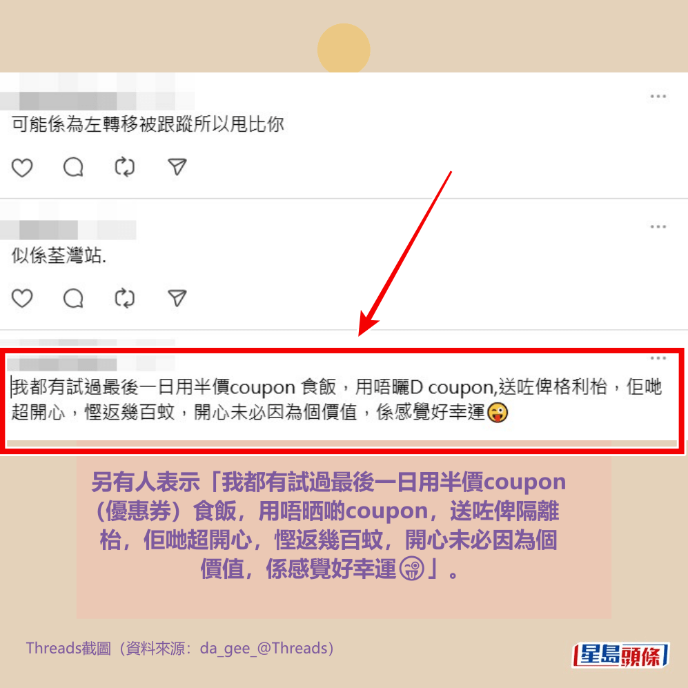 另有人表示「我都有試過最後一日用半價coupon(優惠券)食飯,用唔晒啲coupon,送咗俾隔離枱,佢哋超開心,慳返幾百蚊,開心未必因為個價值,係感覺好幸運😜」。