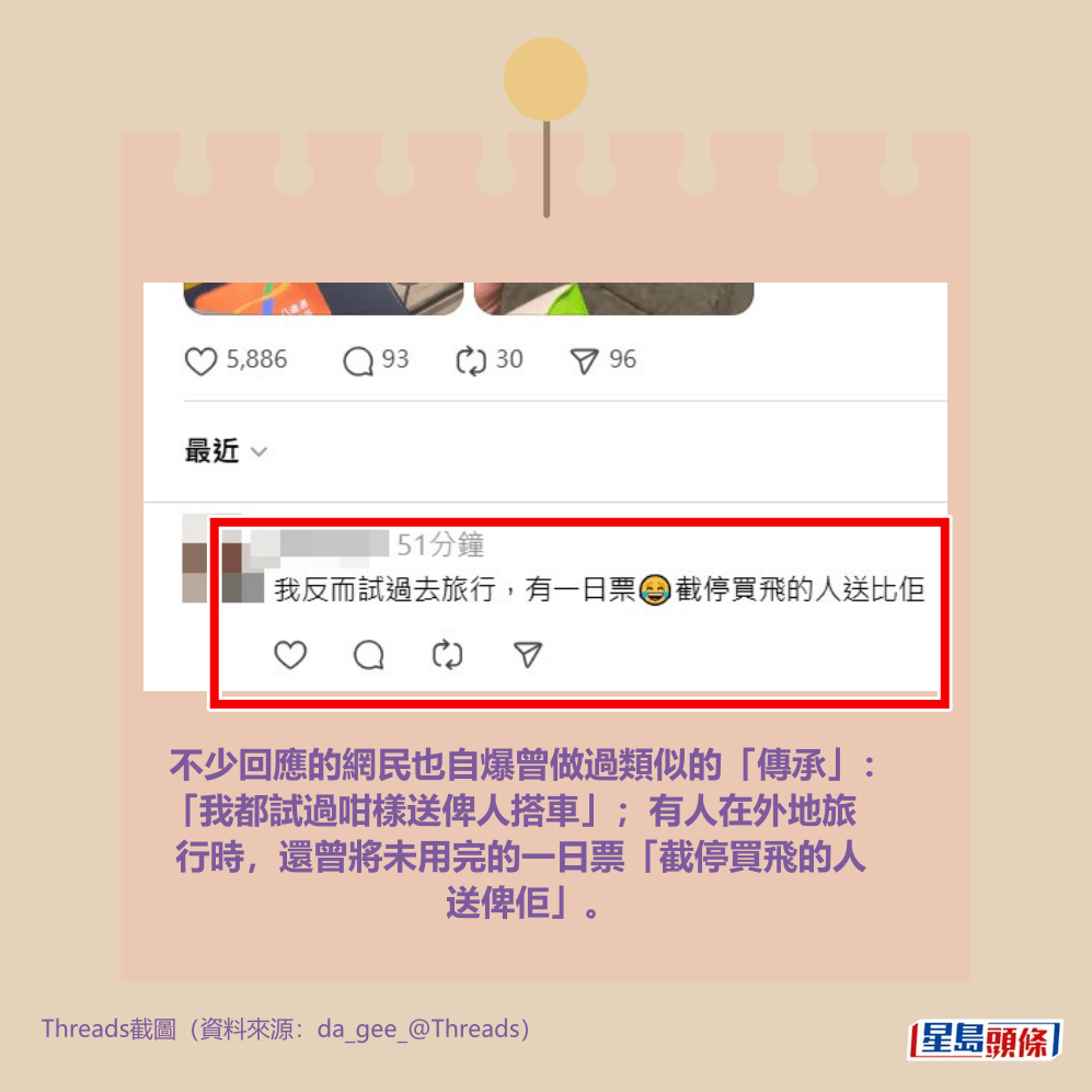 不少回應的網民也自爆曾做過類似的「傳承」:「我都試過咁樣送俾人搭車」;有人在外地旅行時,還曾將未用完的一日票「截停買飛的人送俾佢」。