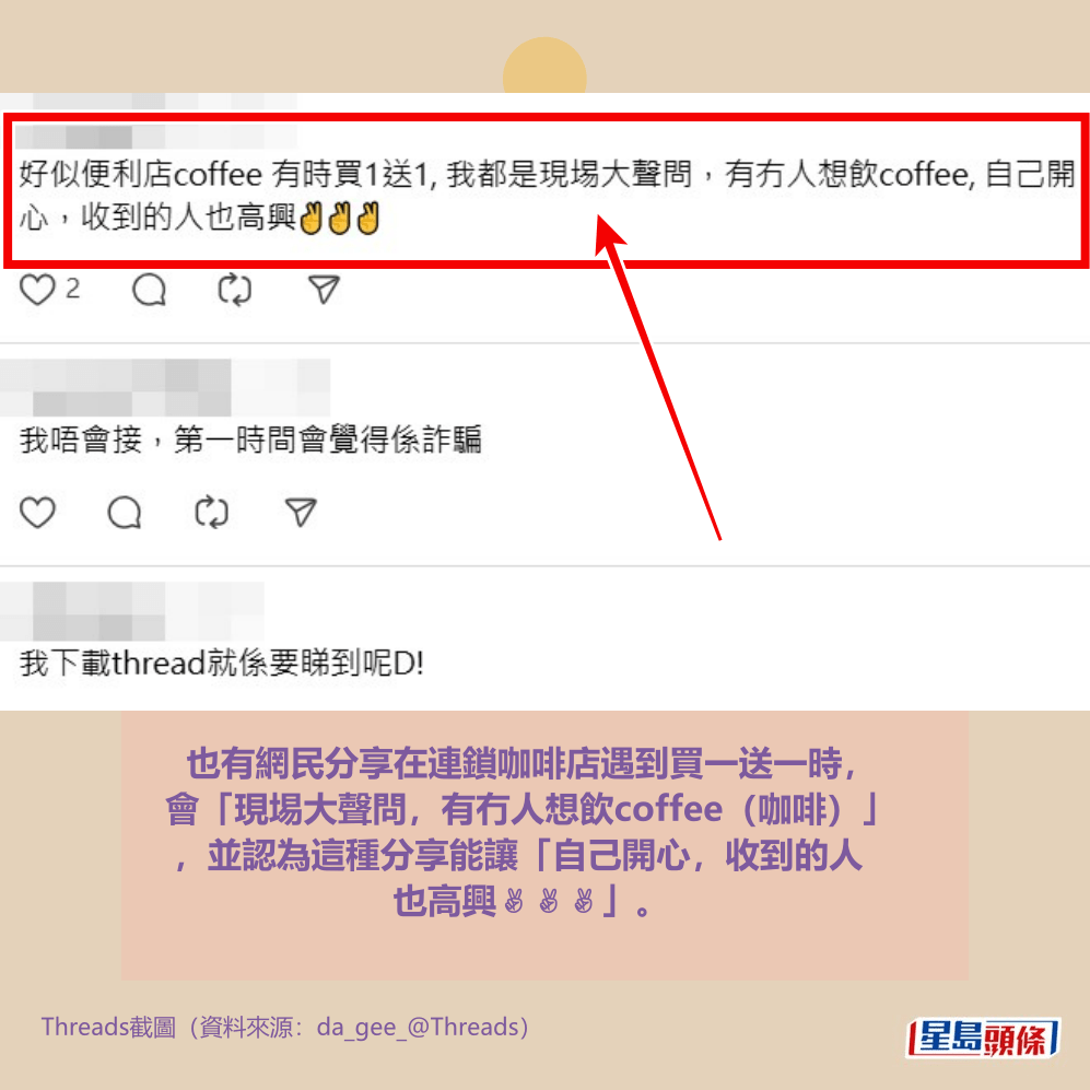 也有網民分享在連鎖咖啡店遇到買一送一時,會「現埸大聲問,有冇人想飲coffee(咖啡)」,並認為這種分享能讓「自己開心,收到的人也高興✌️✌️✌️」。