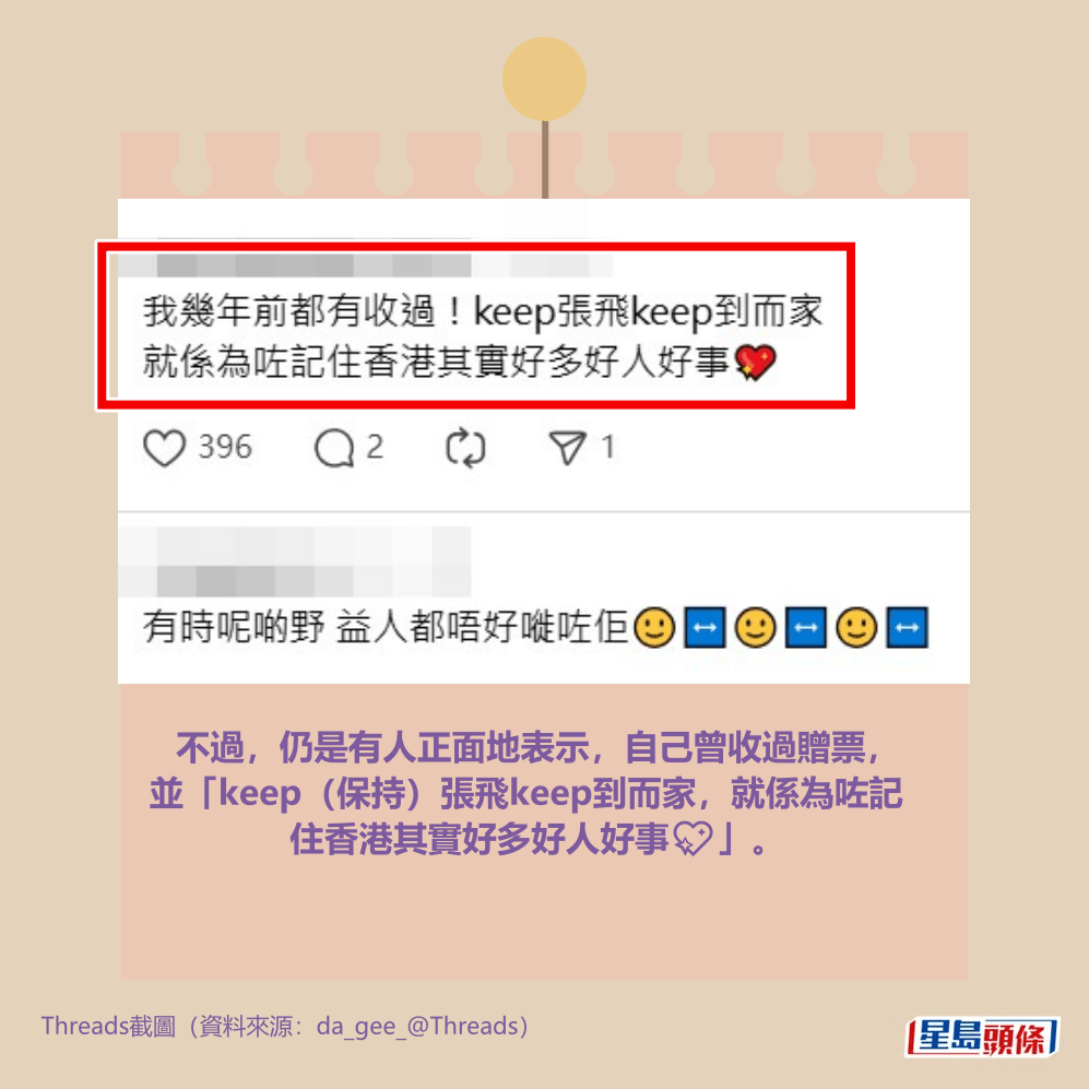 不過,仍是有人正面地表示,自己曾收過贈票,並「keep(保持)張飛keep到而家,就係為咗記住香港其實好多好人好事💖」。