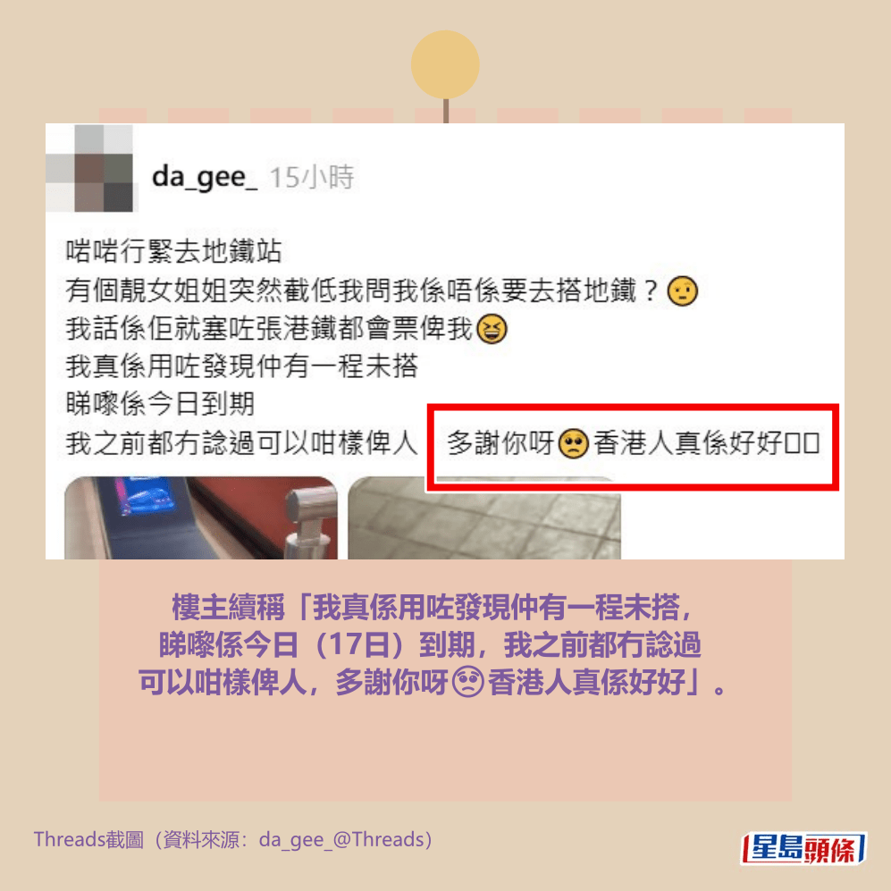 樓主昨日(17日)在社交平台Threads上載相片及短片發帖,指「啱啱行緊去地鐵站,有個靚女姐姐突然截低我問我係唔係要去搭地鐵?🤨我話係佢就塞咗張港鐵都會票俾我😆」。