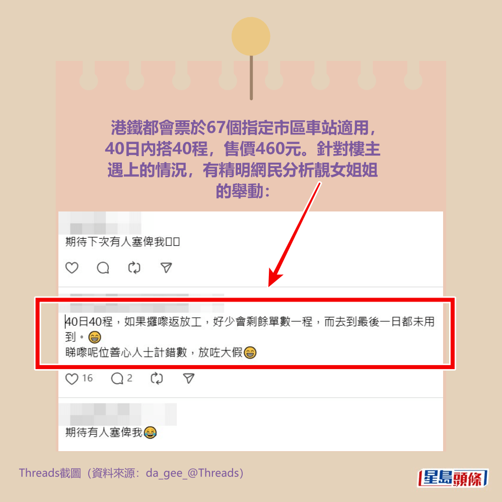 港鐵都會票於67個指定市區車站適用,40日內搭40程,售價460元。針對樓主遇上的情況,有精明網民分析靚女姐姐的舉動,指「40日40程,如果攞嚟返放工,好少會剩餘單數一程,而去到最後一日都未用到。😁睇嚟呢位善心人士計錯數,放咗大假😁」。