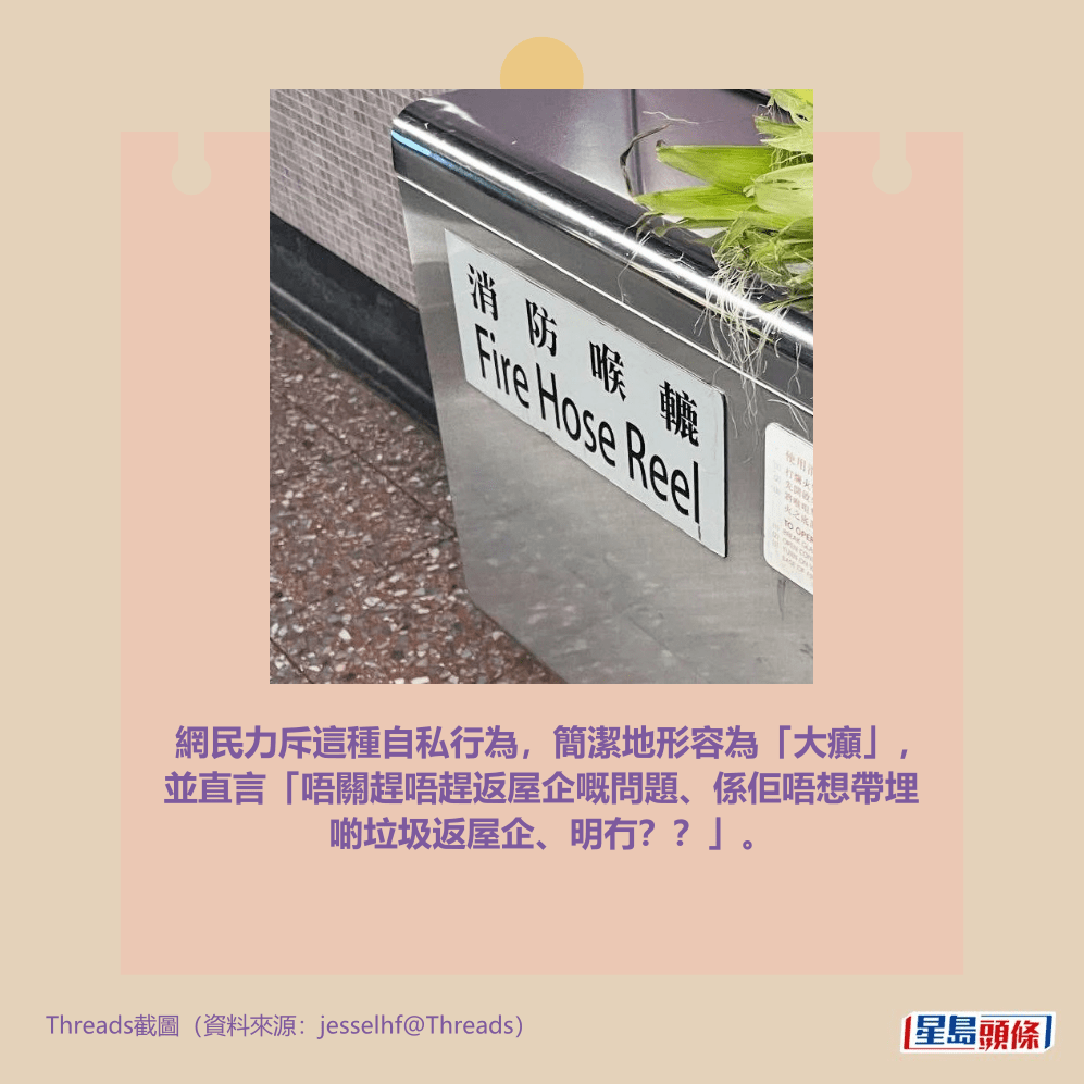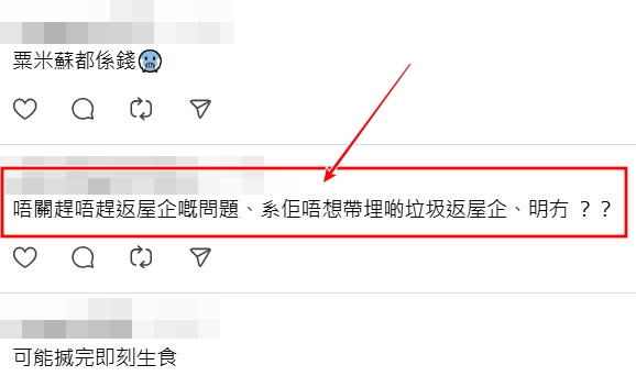 網民力斥這種自私行為,簡潔地形容為「大癲」,並直言「唔關趕唔趕返屋企嘅問題、係佢唔想帶埋啲垃圾返屋企、明冇??」、「其實垃圾桶有很遠嗎?」、「有人幫你執垃圾呀嘛,自己喺屋企唔使執囉」,把自己的方便建築在別人的麻煩之上。另有人正路地估計,「佢以為呢個係垃圾桶,點知行近唔係。然後佢又好冇雷咁走咗」。