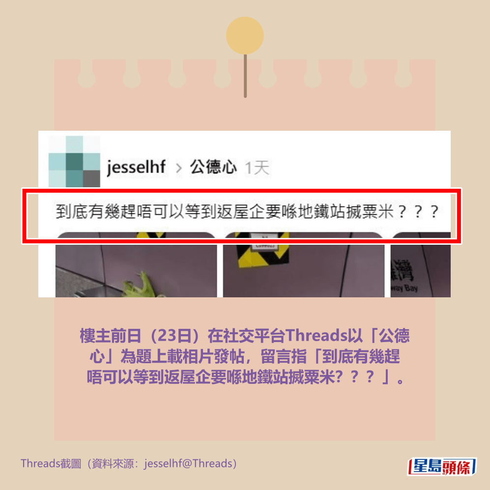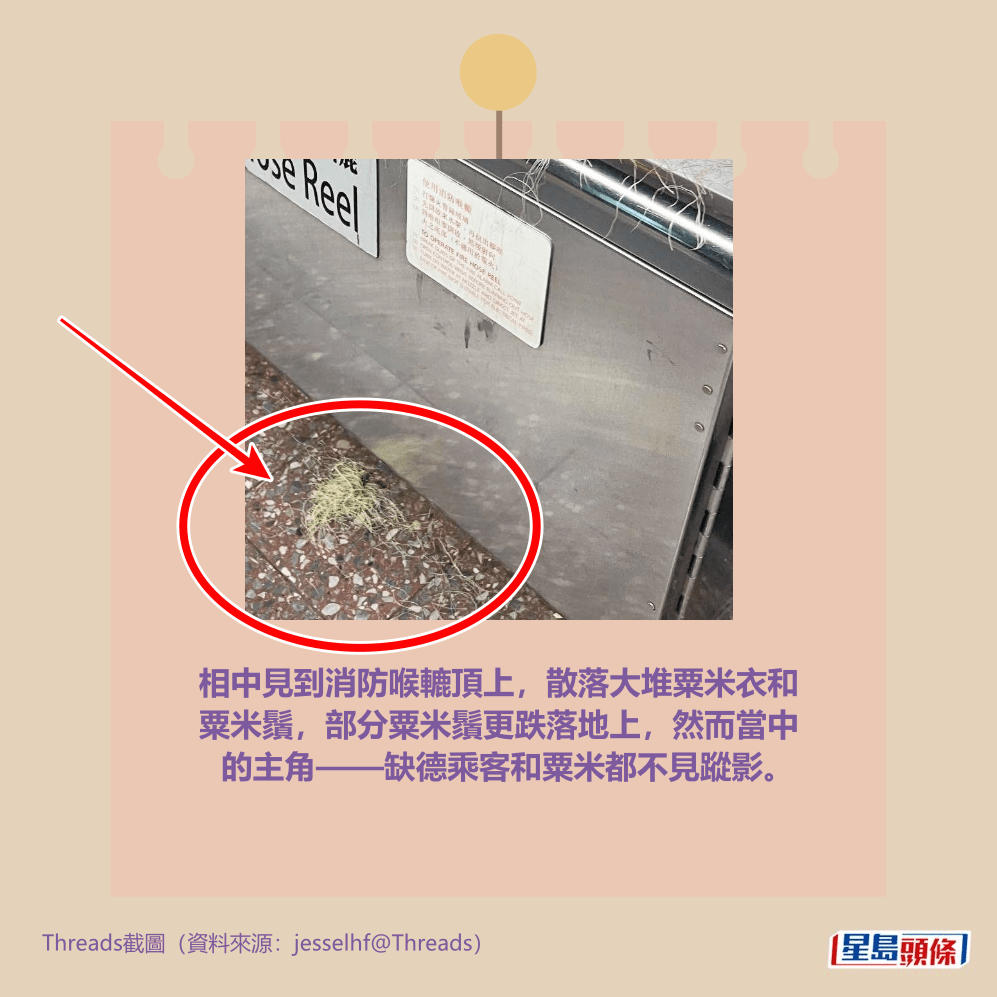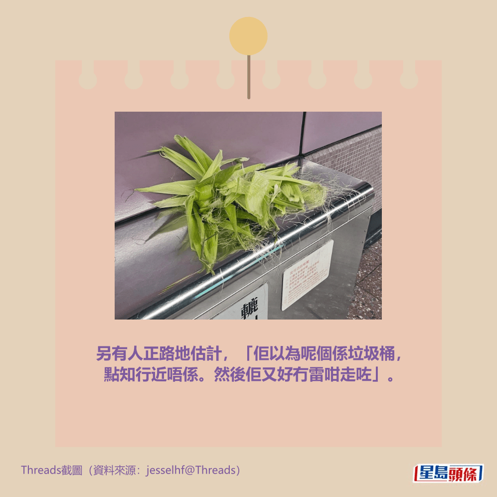 樓主前日(23日)在社交平台Threads以「公德心」為題上載相片發帖,留言指「到底有幾趕唔可以等到返屋企要喺地鐵站搣粟米???」。