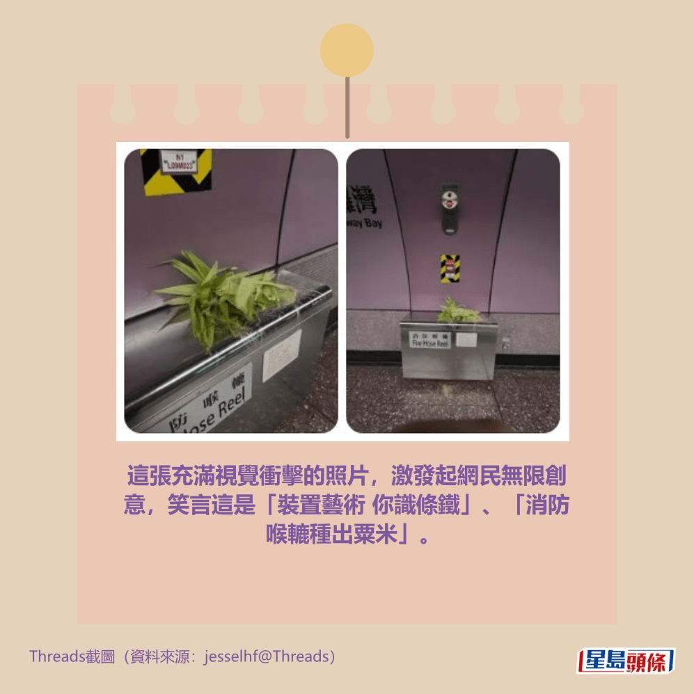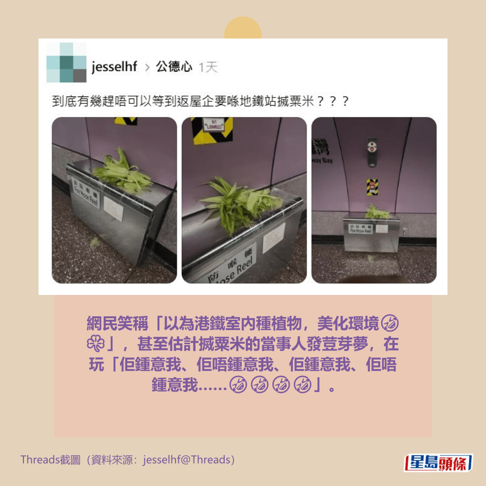 這張充滿視覺衝擊的照片,激發起網民無限創意,笑言這是「裝置藝術 你識條鐵」、「消防喉轆種出粟米」、「以為港鐵室內種植物,美化環境🤣☘️」,甚至估計搣粟米的當事人發荳芽夢,在玩「佢鍾意我、佢唔鍾意我、佢鍾意我、佢唔鍾意我……🤣🤣🤣🤣」。