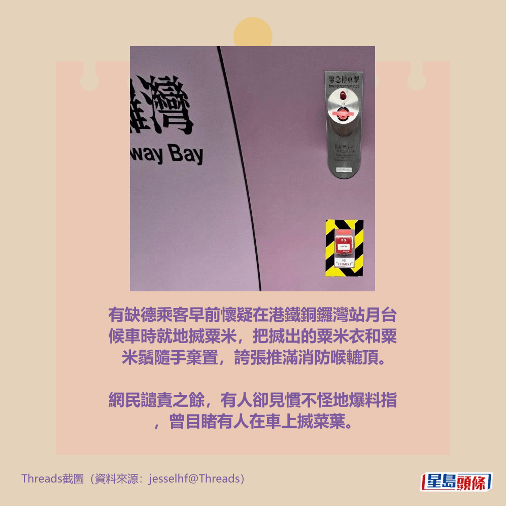 有缺德乘客早前懷疑在港鐵銅鑼灣站月台候車時就地搣粟米,把搣出的粟米衣和粟米鬚隨手棄置,誇張推滿消防喉轆頂。網民讉責之餘,有人卻見慣不怪地爆料指,曾目睹有人在車上搣菜葉。詳情見下圖及下文:
