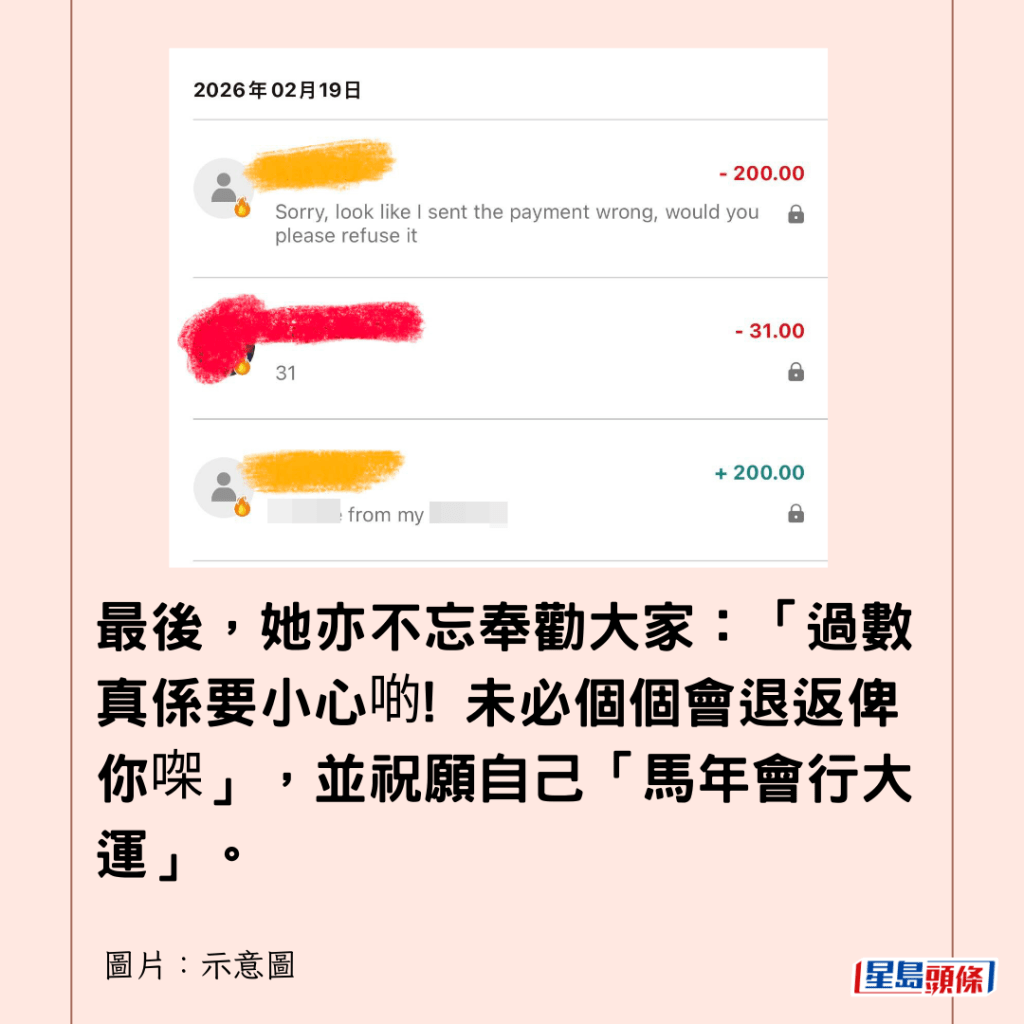 最後,她亦不忘奉勸大家:「過數真係要小心啲! 未必個個會退返俾你㗎」,並祝願自己「馬年會行大運」。
