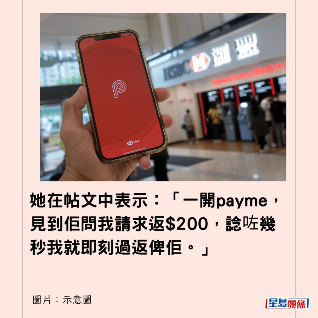 她在帖文中表示:「一開payme,見到佢問我請求返$200,諗咗幾秒我就即刻過返俾佢。」