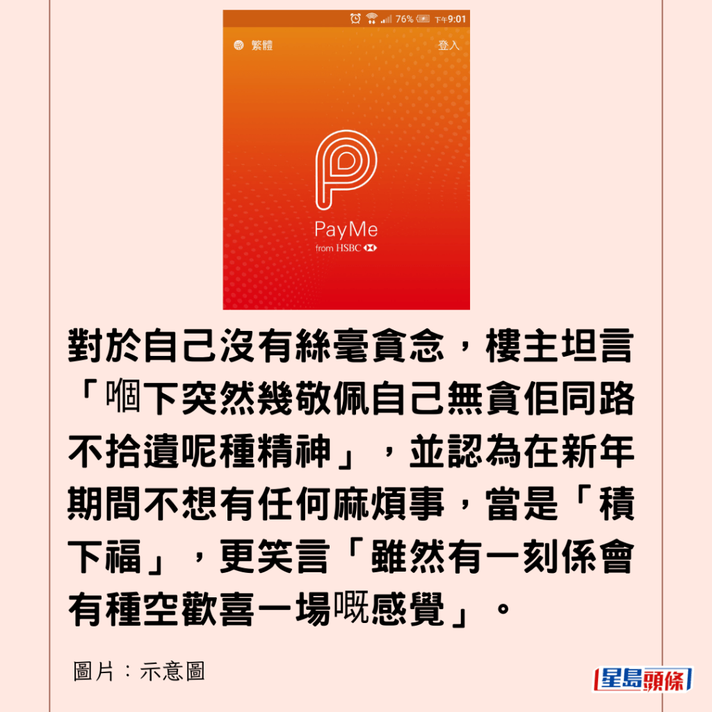 對於自己沒有絲毫貪念,樓主坦言「嗰下突然幾敬佩自己無貪佢同路不拾遺呢種精神」,並認為在新年期間不想有任何麻煩事,當是「積下福」,更笑言「雖然有一刻係會有種空歡喜一場嘅感覺」。
