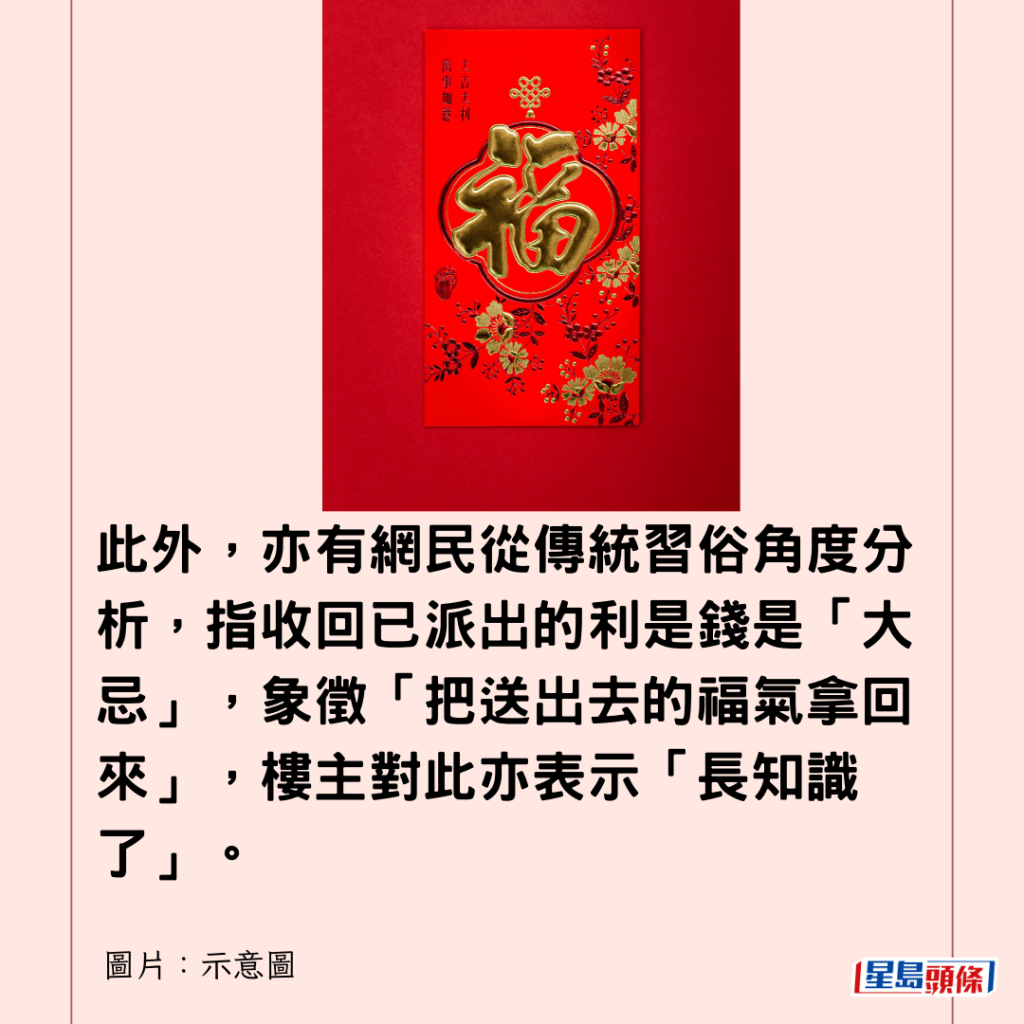 此外,亦有網民從傳統習俗角度分析,指收回已派出的利是錢是「大忌」,象徵「把送出去的福氣拿回來」,樓主對此亦表示「長知識了」。