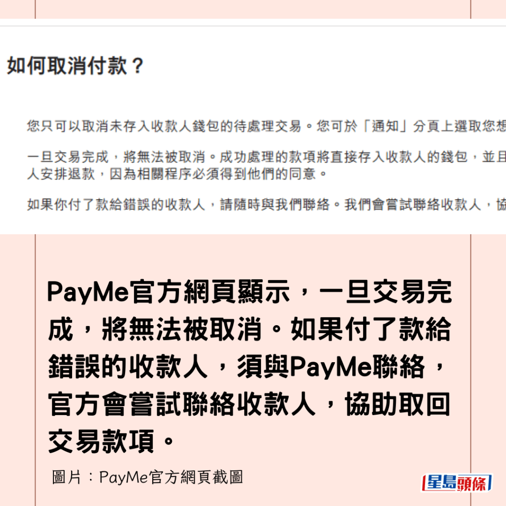 PayMe官方網頁顯示,一旦交易完成,將無法被取消。如果付了款給錯誤的收款人,須與PayMe聯絡,官方會嘗試聯絡收款人,協助取回交易款項。