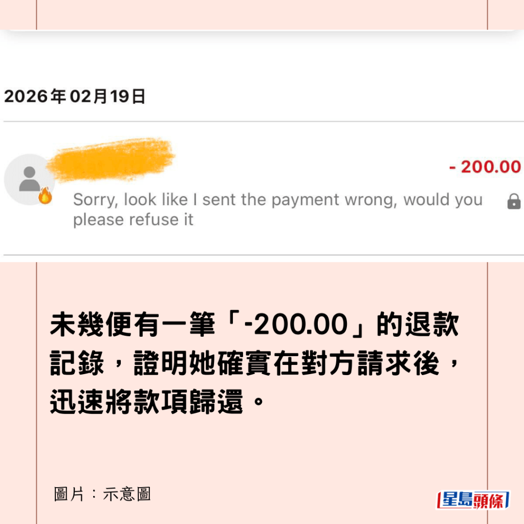 從她分享的PayMe截圖可見,交易記錄顯示在2月19日,她先收到一筆「+200.00」的款項,未幾便有一筆「-200.00」的退款記錄,證明她確實在對方請求後,迅速將款項歸還。