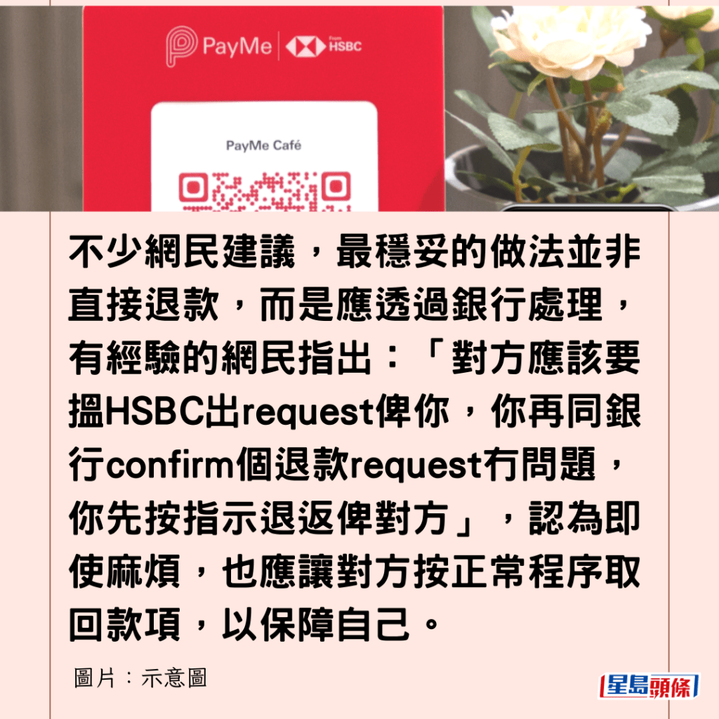 不少網民建議,最穩妥的做法並非直接退款,而是應透過銀行處理,有經驗的網民指出:「對方應該要搵HSBC出request俾你,你再同銀行confirm個退款request冇問題,你先按指示退返俾對方」,認為即使麻煩,也應讓對方按正常程序取回款項,以保障自己。