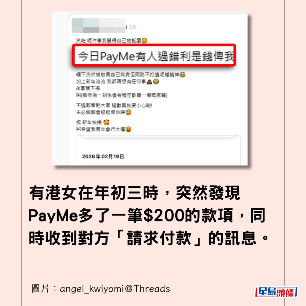 有港女在年初三(19日)時,突然發現PayMe多了一筆$200的款項,同時收到對方「請求付款」的訊息。