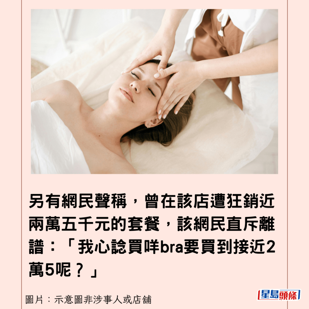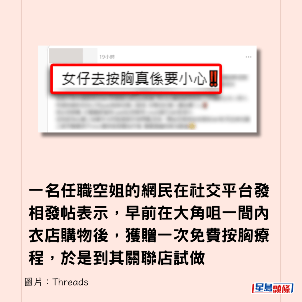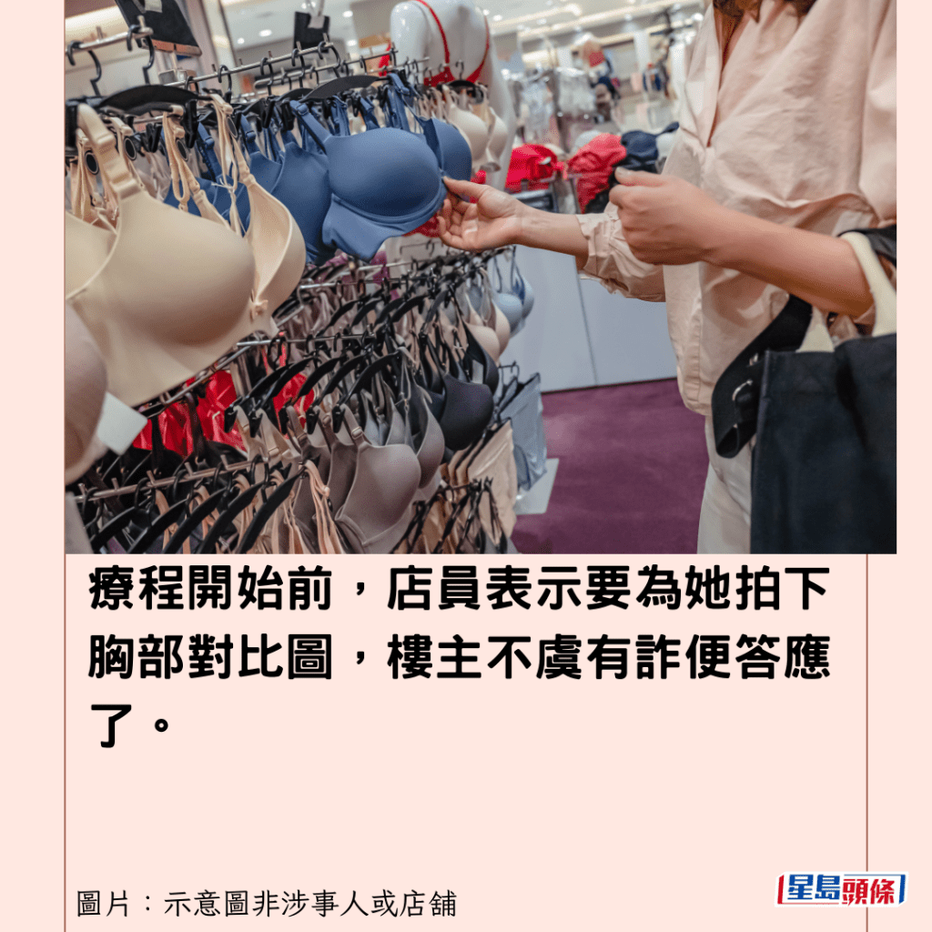 女事主昨日(24日)在社交平台發相發帖表示,早前在大角咀一間內衣店購物後,獲贈一次免費按胸療程,於是到其關聯店試做,療程開始前,店員表示要為她拍下胸部對比圖,樓主不虞有詐便答應了。