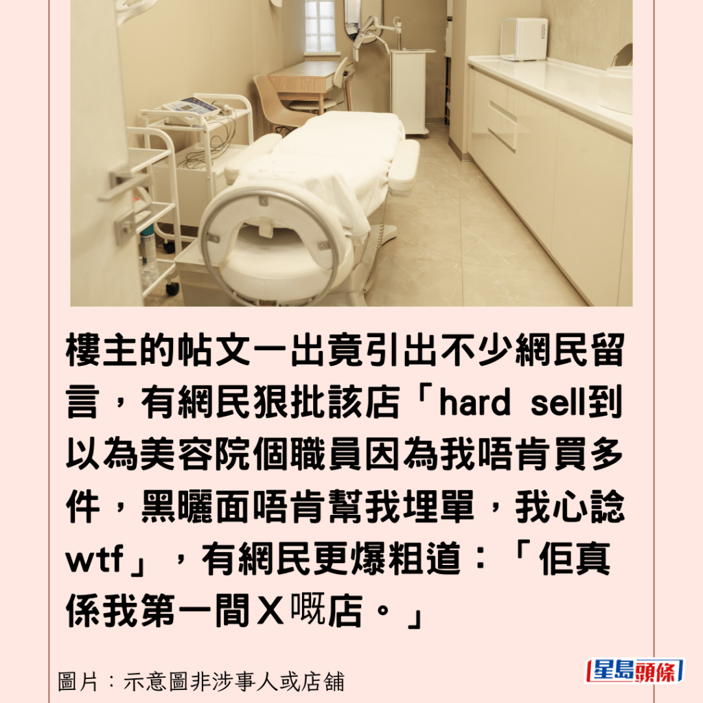 樓主的帖文一出竟引出不少網民留言,申訴在同一間店舖中過伏,矛頭直指該店的銷售手法,有網民狠批該店「hard sell到以為美容院個職員因為我唔肯買多件,黑曬面唔肯幫我埋單,我心諗wtf」,有網民更爆粗道:「佢真係我第一間X嘅店。」
