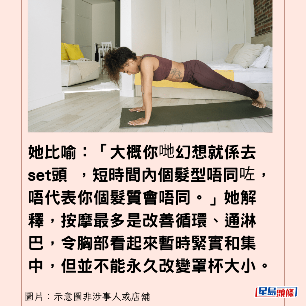 對此,一名自稱是按摩師的網民提供了專業見解,她強調:「按摩係唔會幫到你改善到胸形的」,並重覆了三次以作強調。她比喻:「大概你哋幻想就係去set頭 ,短時間內個髮型唔同咗,唔代表你個髮質會唔同。」她解釋,按摩最多是改善循環、通淋巴,令胸部看起來暫時緊實和集中,但並不能永久改變罩杯大小。
