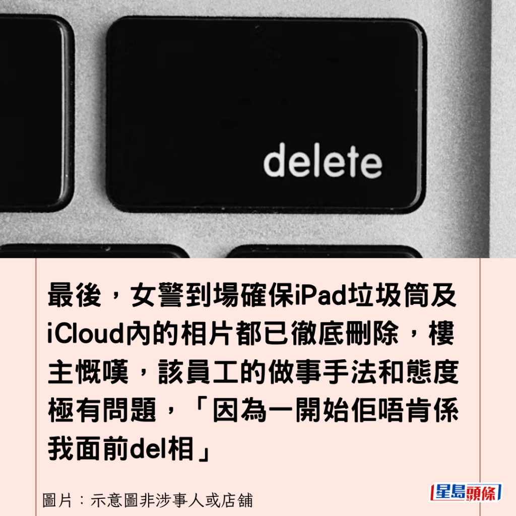 最後,女警到場確保iPad垃圾筒及iCloud內的相片都已徹底刪除,樓主慨嘆,該員工的做事手法和態度極有問題,「因為一開始佢唔肯係我面前del相」,樓主更表示,連店內其他員工也向警員指證該職員態度惡劣,「警員建議我報消委會。」