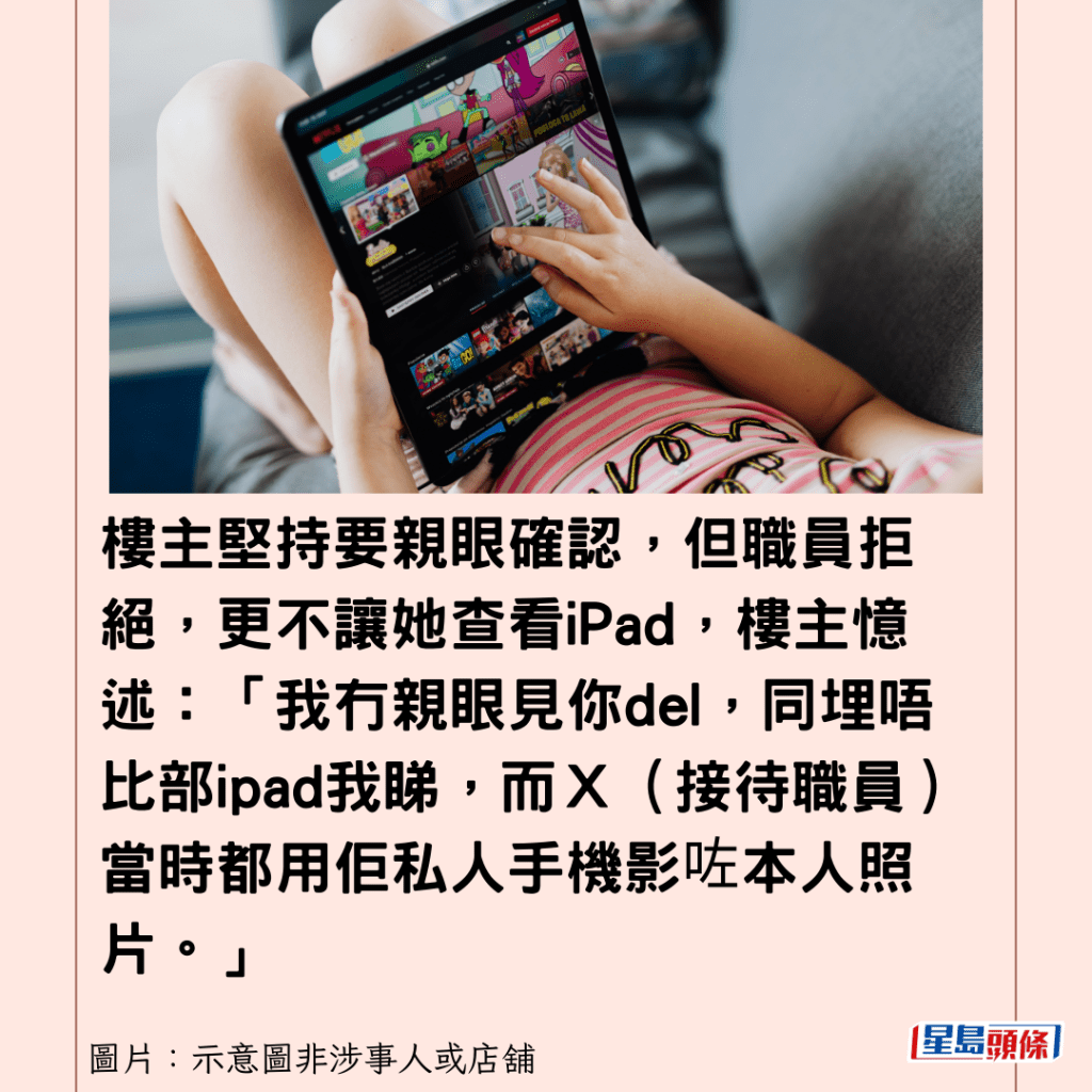 樓主堅持要親眼確認,但職員拒絕,更不讓她查看iPad,樓主憶述:「我冇親眼見你del,同埋唔比部ipad我睇,而X(接待職員)當時都用佢私人手機影咗本人照片。」她更瞥見公司的iPad內存有其他客人的胸部照片,令她極度不安,決定報警求助。