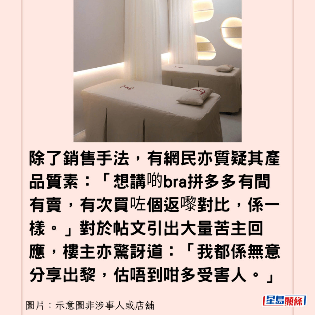 除了銷售手法,有網民亦質疑其產品質素:「想講啲bra拼多多有間有賣,有次買咗個返嚟對比,係一樣。」對於帖文引出大量苦主回應,樓主亦驚訝道:「我都係無意分享出黎,估唔到咁多受害人。」