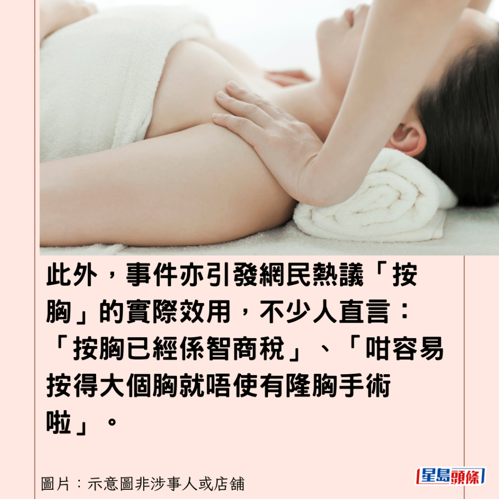 此外,事件亦引發網民熱議「按胸」的實際效用,不少人直言:「按胸已經係智商稅」、「咁容易按得大個胸就唔使有隆胸手術啦」。