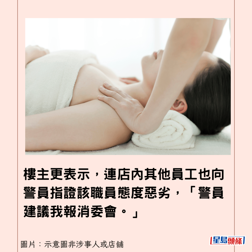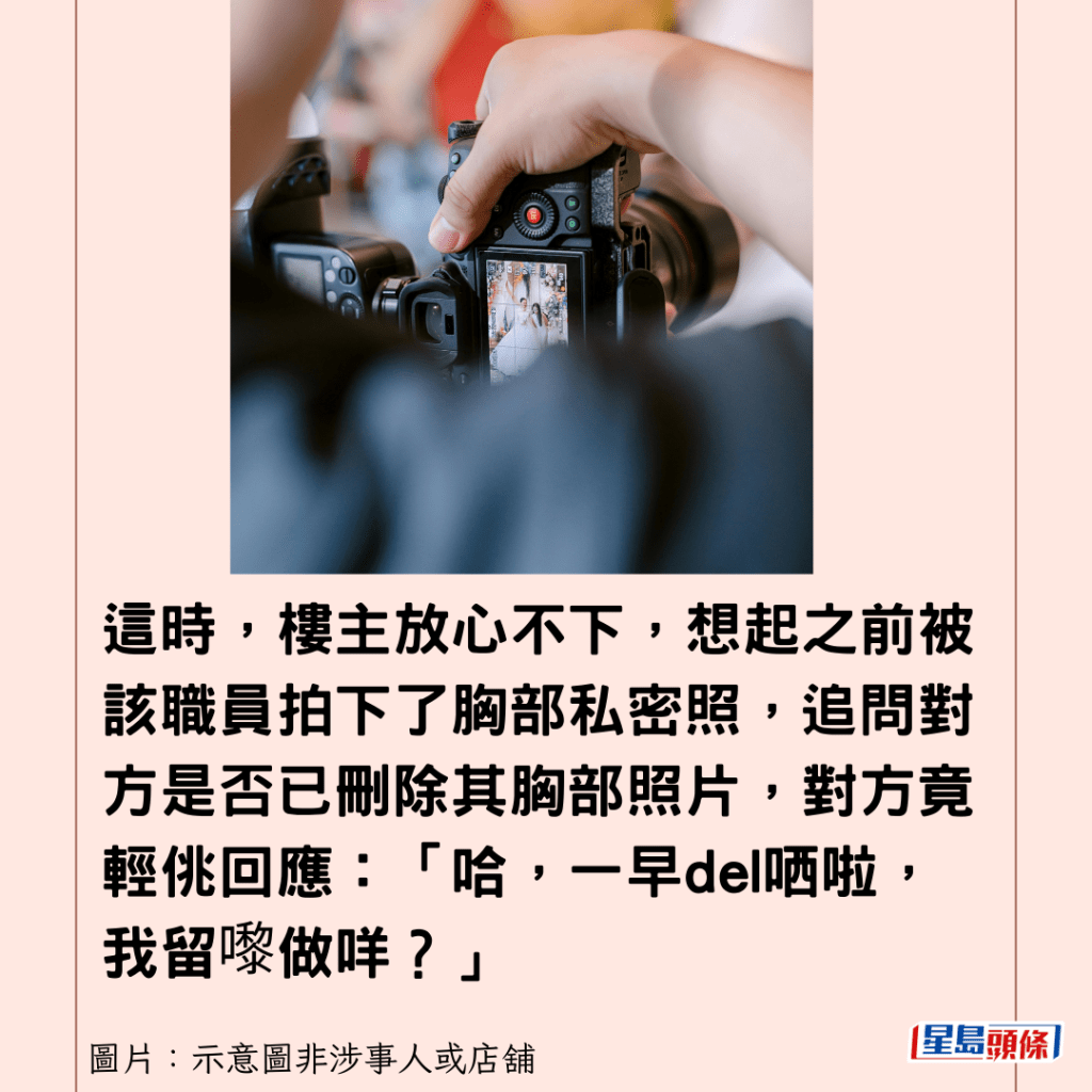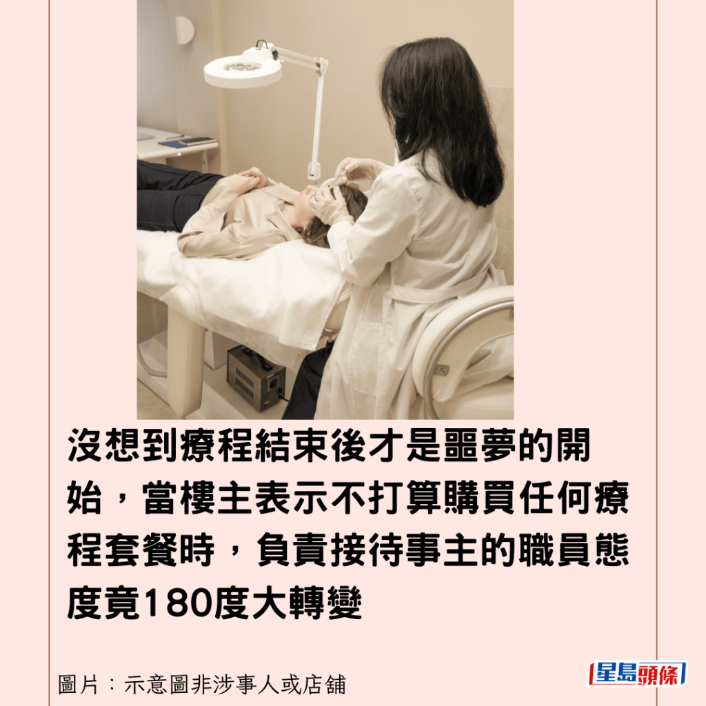 沒想到療程結束後才是噩夢的開始,當樓主表示不打算購買任何療程套餐時,負責接待事主的職員態度竟180度大轉變,這時,樓主放心不下,想起之前被該職員拍下了胸部私密照,追問對方是否已刪除其胸部照片,對方竟輕佻回應:「哈,一早del哂啦,我留嚟做咩?」