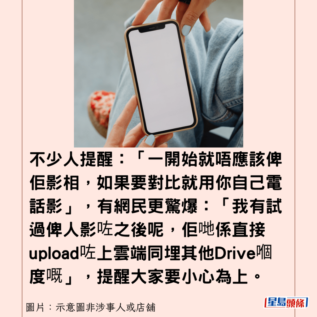 不少人提醒:「一開始就唔應該俾佢影相,如果要對比就用你自己電話影」,有網民更驚爆:「我有試過俾人影咗之後呢,佢哋係直接upload咗上雲端同埋其他Drive嗰度嘅」,提醒大家要小心為上。
