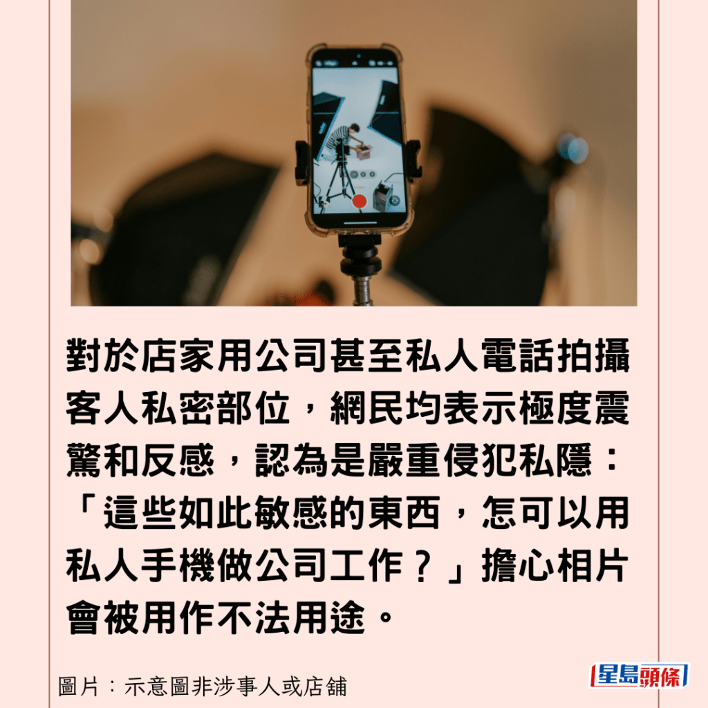 對於店家用公司甚至私人電話拍攝客人私密部位,網民均表示極度震驚和反感,認為是嚴重侵犯私隱:「這些如此敏感的東西,怎可以用私人手機做公司工作?」擔心相片會被用作不法用途。