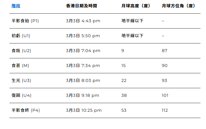 根據太空館的資料,月全食的全食階段始於下午7時04分,此時月球完全進入地球本影,並將持續約59分鐘。隨後的月偏食階段將於下午9時18分結束。香港下一次可見的月全食的全食階段將於2029年1月1日發生。