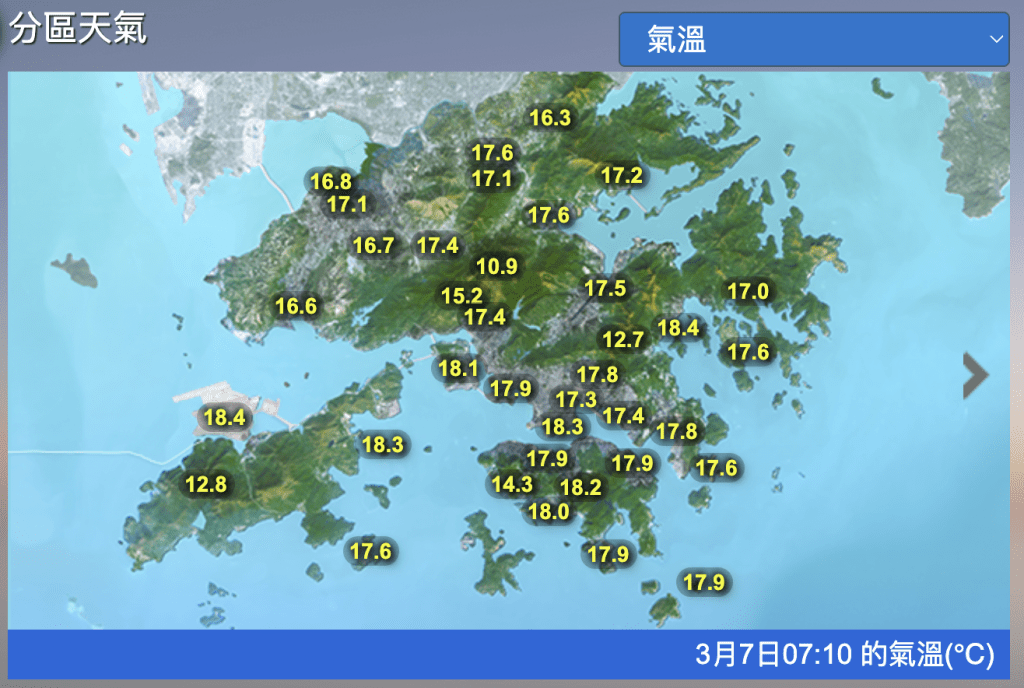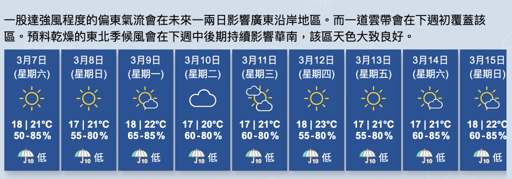 ⾸⾴ 即時港聞 天文台|日間乾燥 最高氣溫約21度 離岸及高地間中吹強風 2026-03-06 16:25:00 一股偏東氣流正影響廣東沿岸。 本港地區大致天晴。日間乾燥,最高氣溫約21度。吹清勁偏東風,離岸及高地間中吹強風。 日間乾燥,最高氣溫約21度。黎志偉攝 日間乾燥,最高氣溫約21度。黎志偉攝 日間乾燥,最高氣溫約21度。黎志偉攝 日間乾燥,最高氣溫約21度。黎志偉攝 展望未來一兩日大致天晴,風勢頗大。下週中期雲量較多。